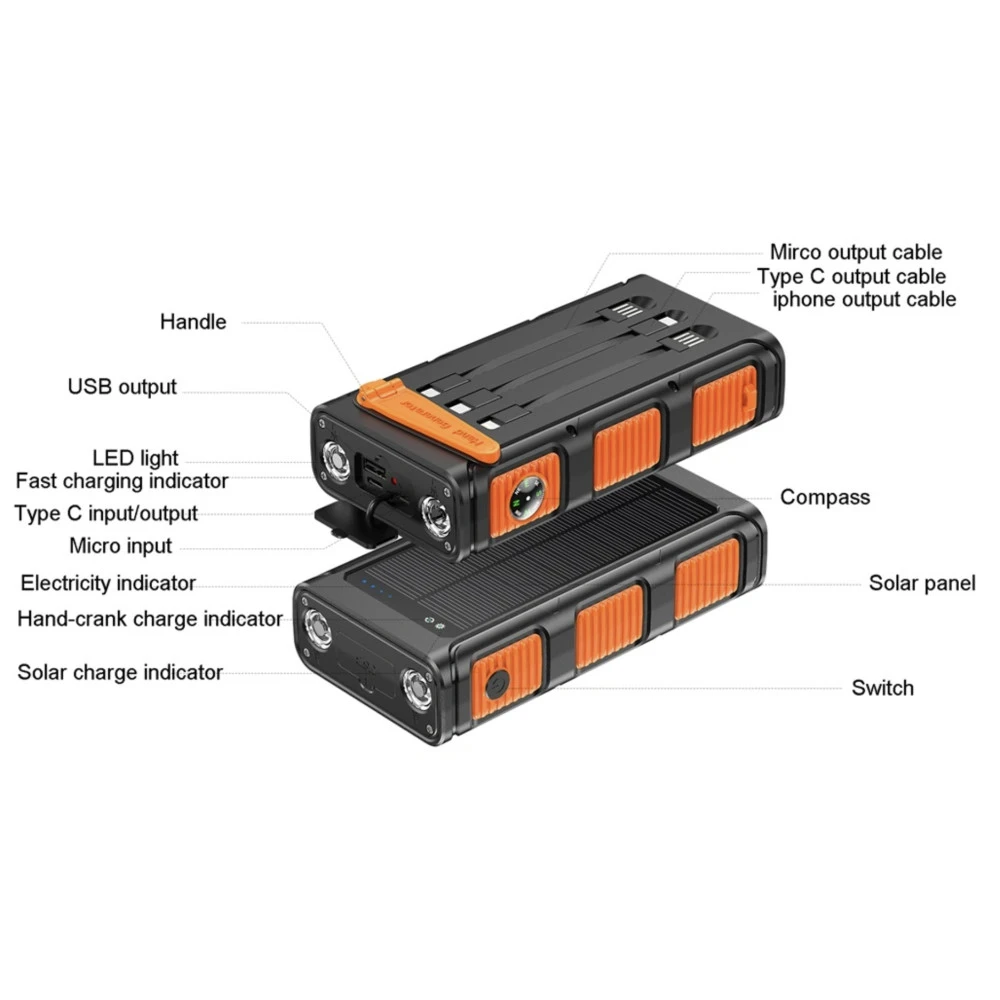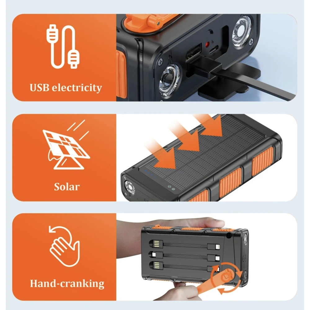 IMPORTANT: Please fully charge the unit before going out. Solar/Crank charging is the backup charging function when you are outdoors or camping, but it should not be the major method to charge it.