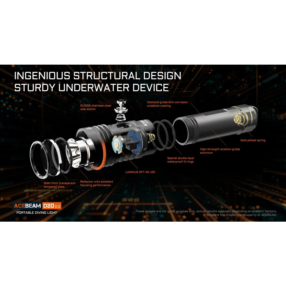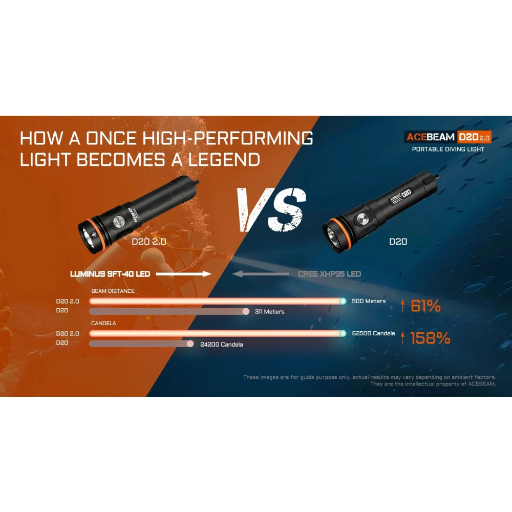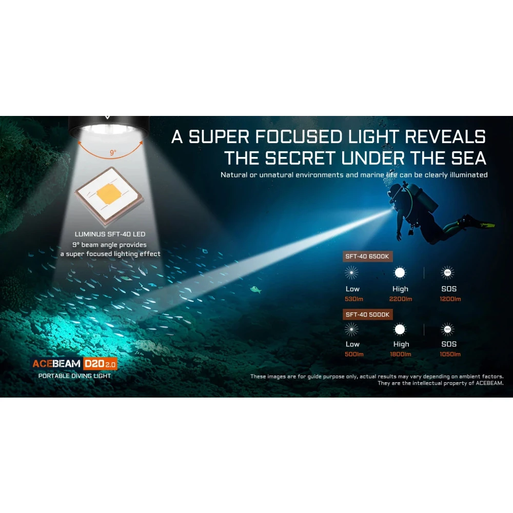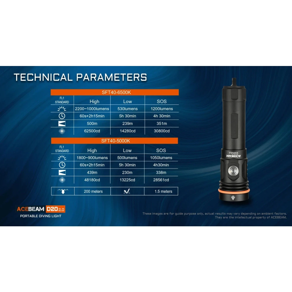 - Utilising Luminus SFT40, the maximum brightness reaches 2200 lumens, and the throwing distance is 500 metres
