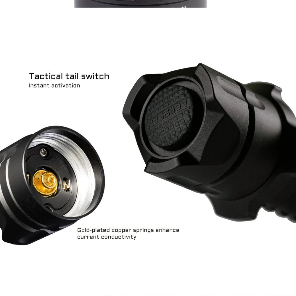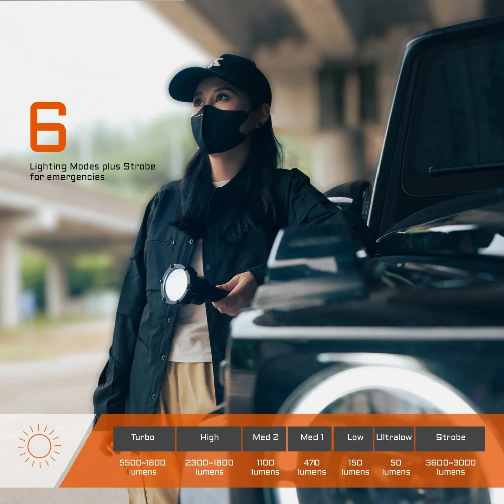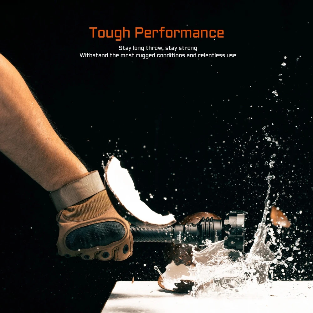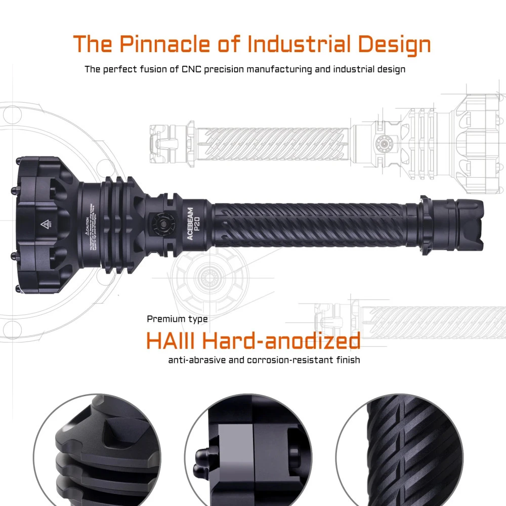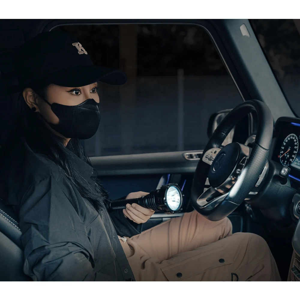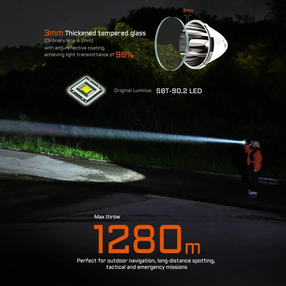 - Utilises a Luminus SBT-90.2 LED, boasting 5500 lumens output and a throw distance of 1280 metres.