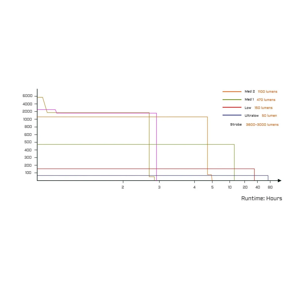 Turbo: 5500 ~ 1800 lumens; 409600cd; 1280 metres; 70 seconds + 2 hours 40 minutes