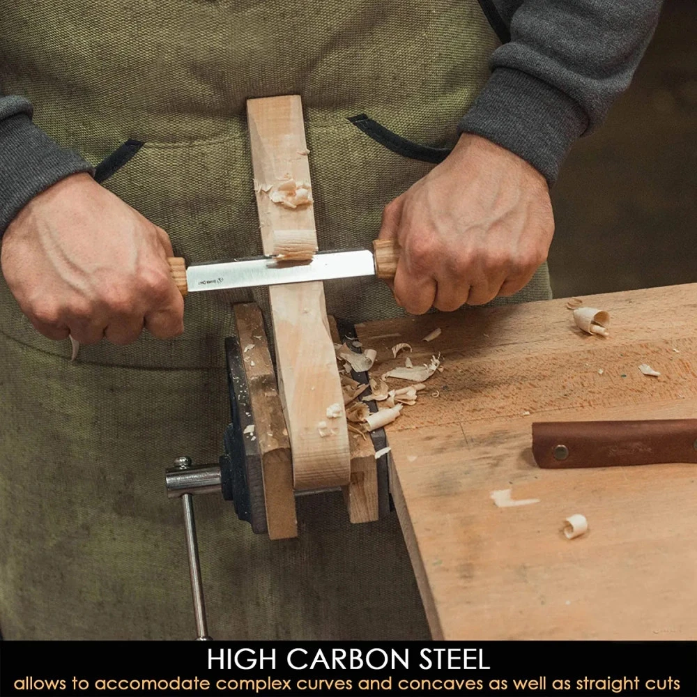A drawknife (drawing knife, draw shave, shaving knife) is a perfect tool if you want to remove thin slices (shavings) of wood for flat faceted wood work. This shaving knife is designed for planing faceted parts or shaping a small circle. The blade has a thickness of only 3 mm, since this knife is designed for finishing delicate work. The blade is made from durable high carbon steel, hardened and well sharpened, and, when not in use, is protected by a leather sheath. The handles are made from Ashwood and covered with natural linseed oil.