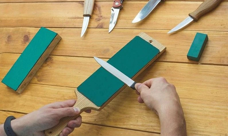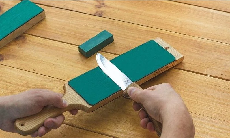 The polishing compound is rubbed on top of the leather strop and should be applied across the entire surface. Once you have chosen a tool, press lightly on the polishing pad and use downwards or upwards motion moving the chosen instrument away or towards you lightly. This should be polishing and sharpening against the polishing compound successfully.
