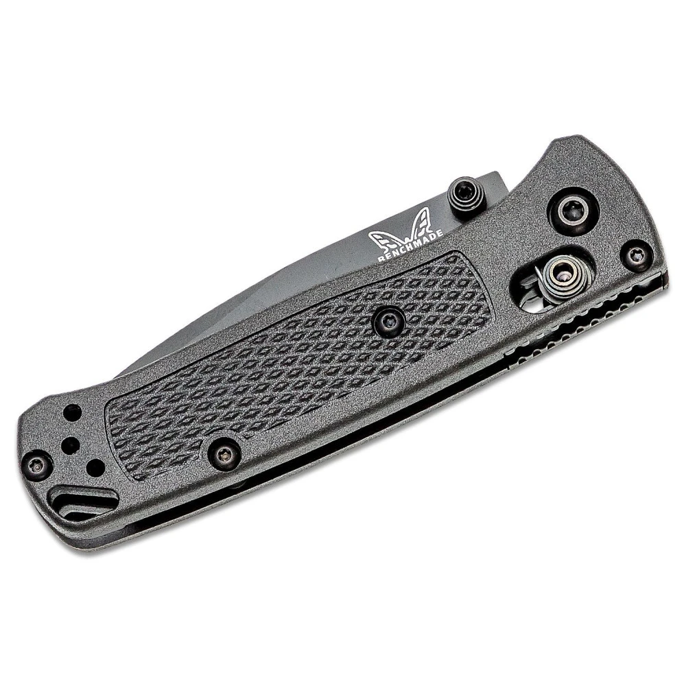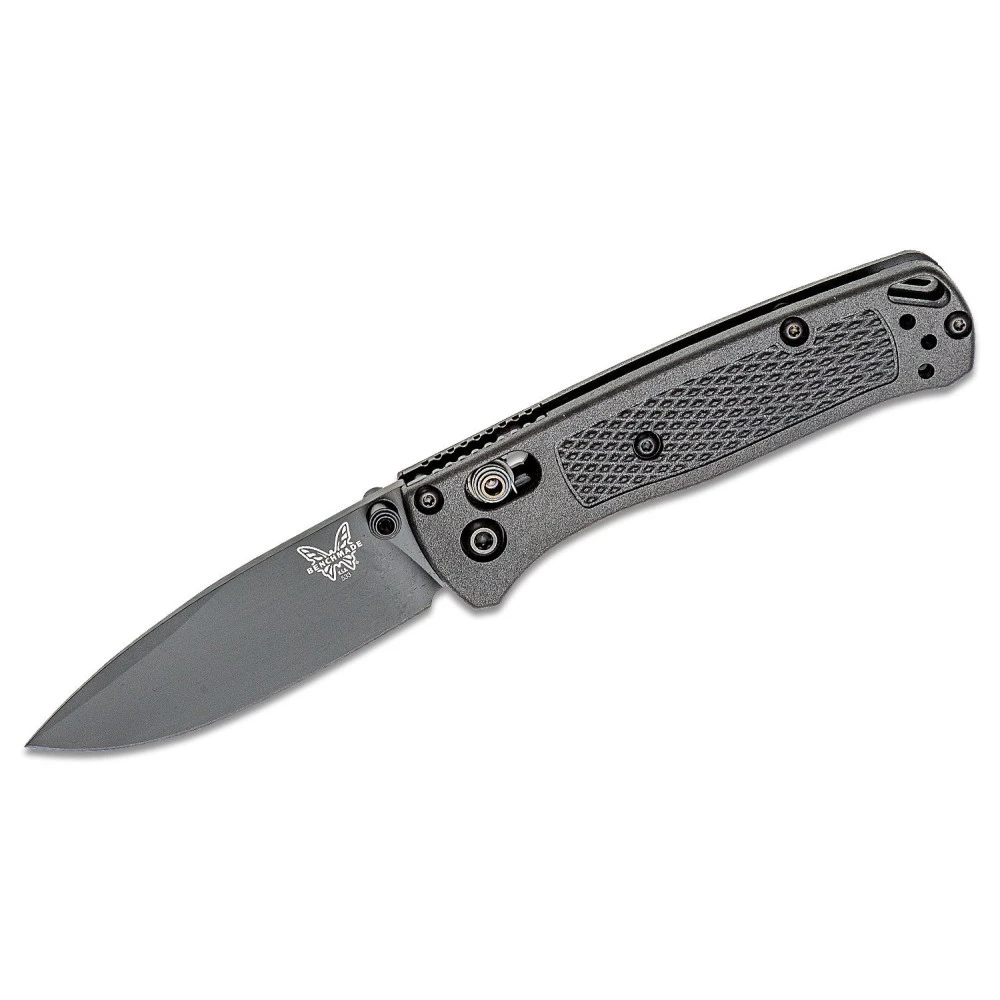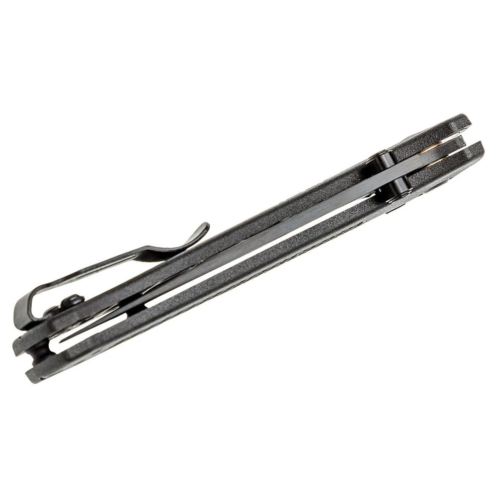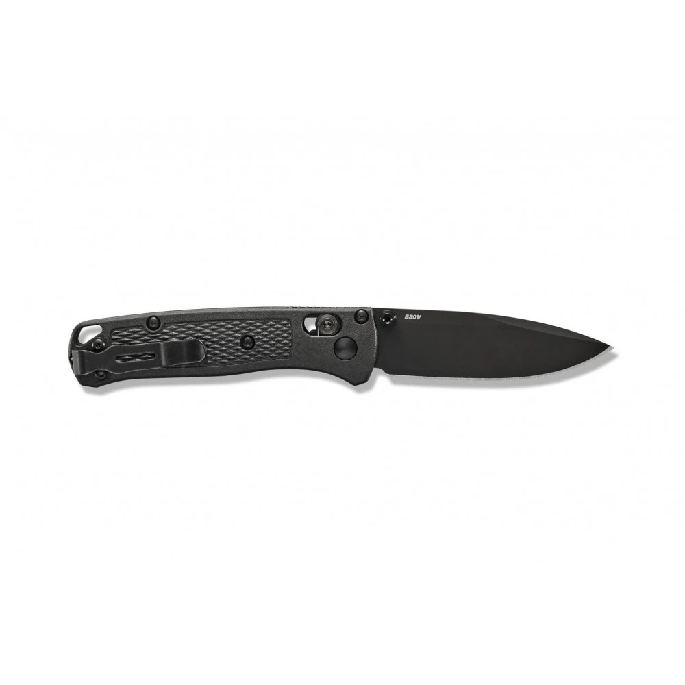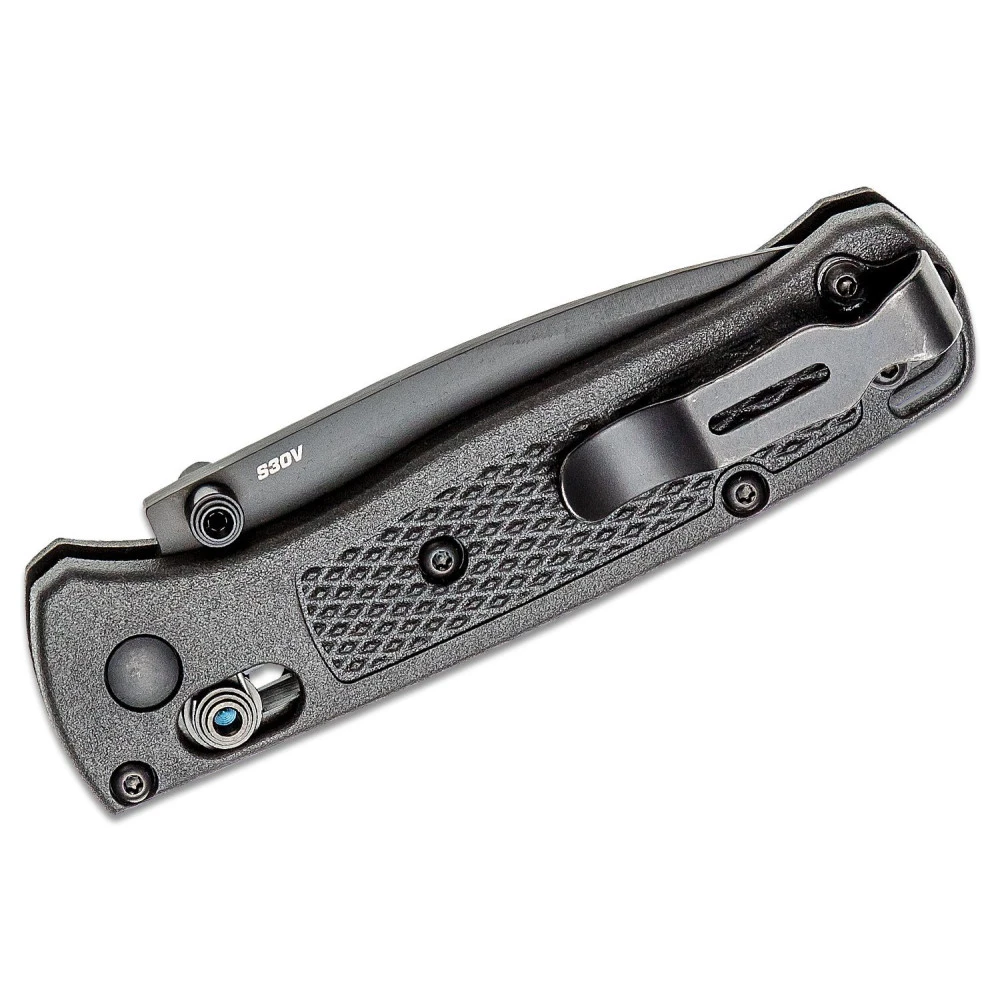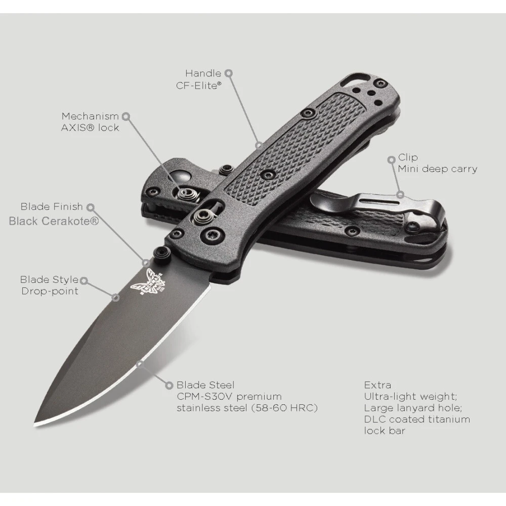 The 533BK-2 Mini Bugout knife is built with black CF-Elite scales and a black Cerakote blade with a plain cutting edge. It’s all you love about the Bugout, but smaller. It is lightweight, and ergonomic, designed with everyday carry and general outdoor use in mind. Its high-performance CPM-S30V blade sports a partial swedge to provide a finer point, and comes fitted with black dual thumb studs for easy one-handed operation. The comfortable handle has been textured on either side for added grip without being abrasive. Comes complete with an oversized lanyard hole and reversible deep-carry clip for convenient EDC.