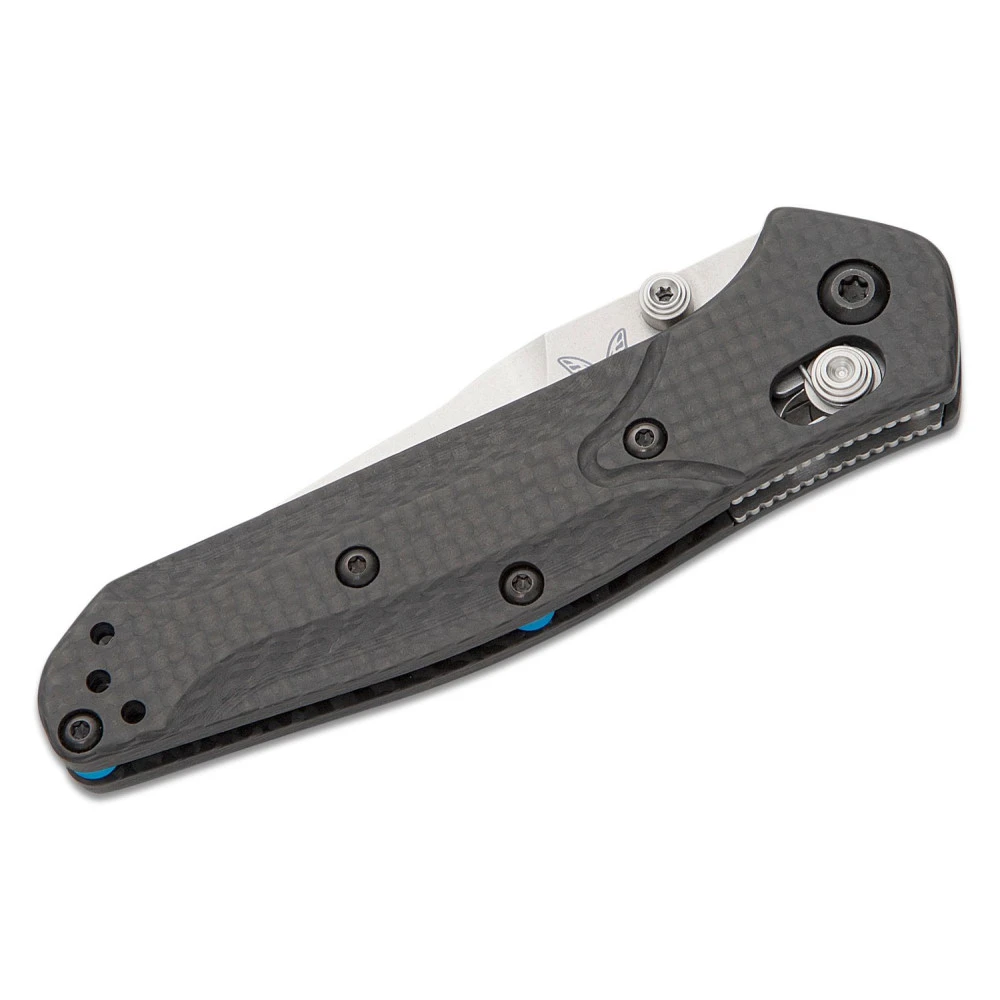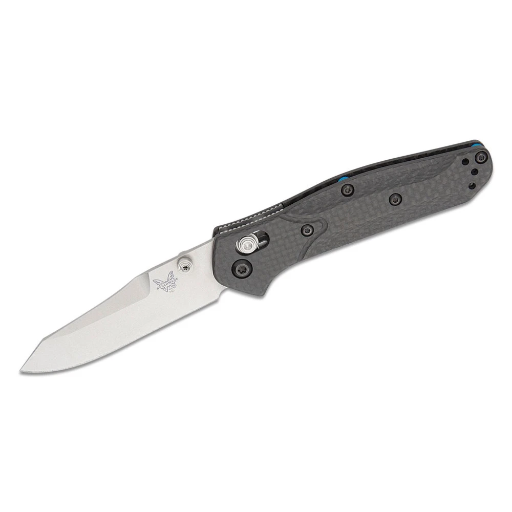 The Mini Osborne 945-2 takes its cues from the full-size 940-1, the lightweight carbon fibre scales accentuated with blue anodised barrel spacers, but has a scaled-down overall profile. This knife also has the classic Osborne reverse tanto blade shape in CPM-S90V.