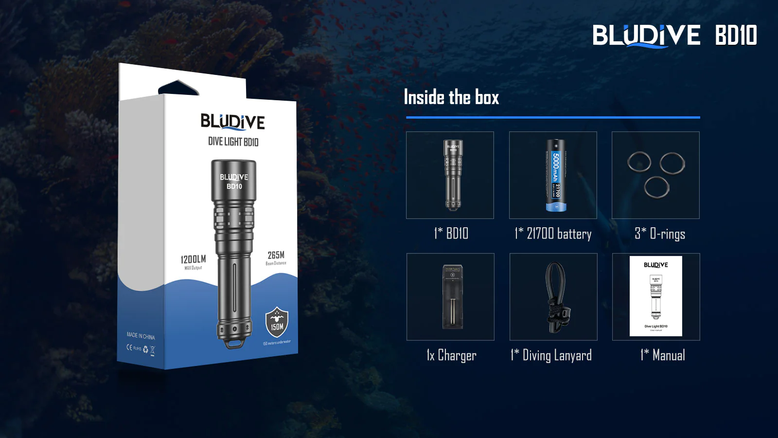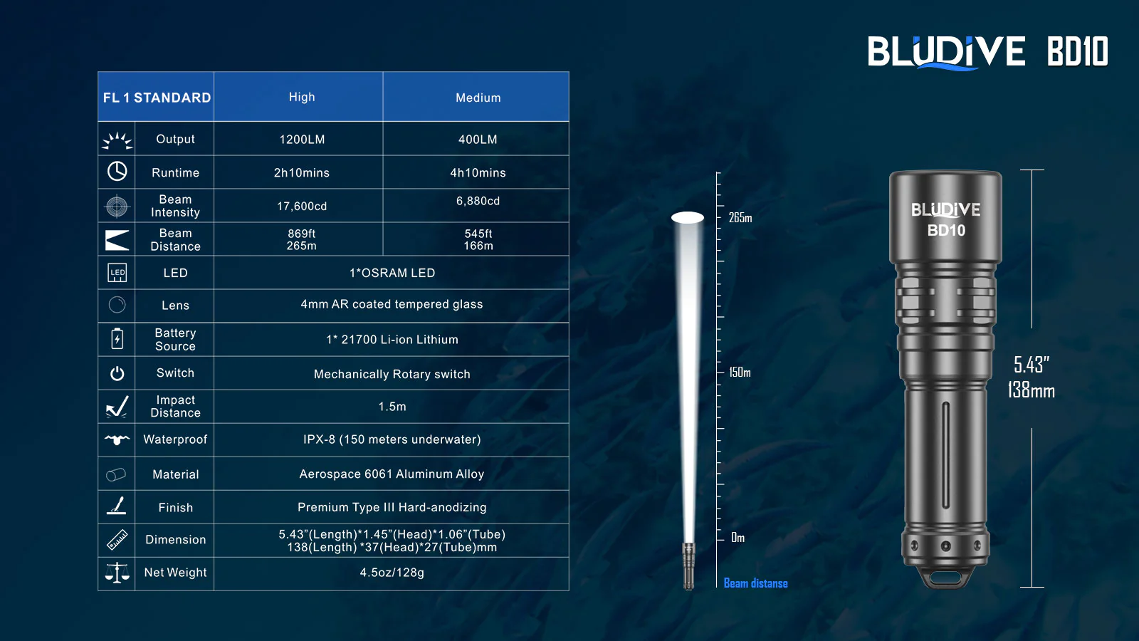 - Two brightness settings, qualified as a primary light for recreational divers or as a backup light for technical divers
