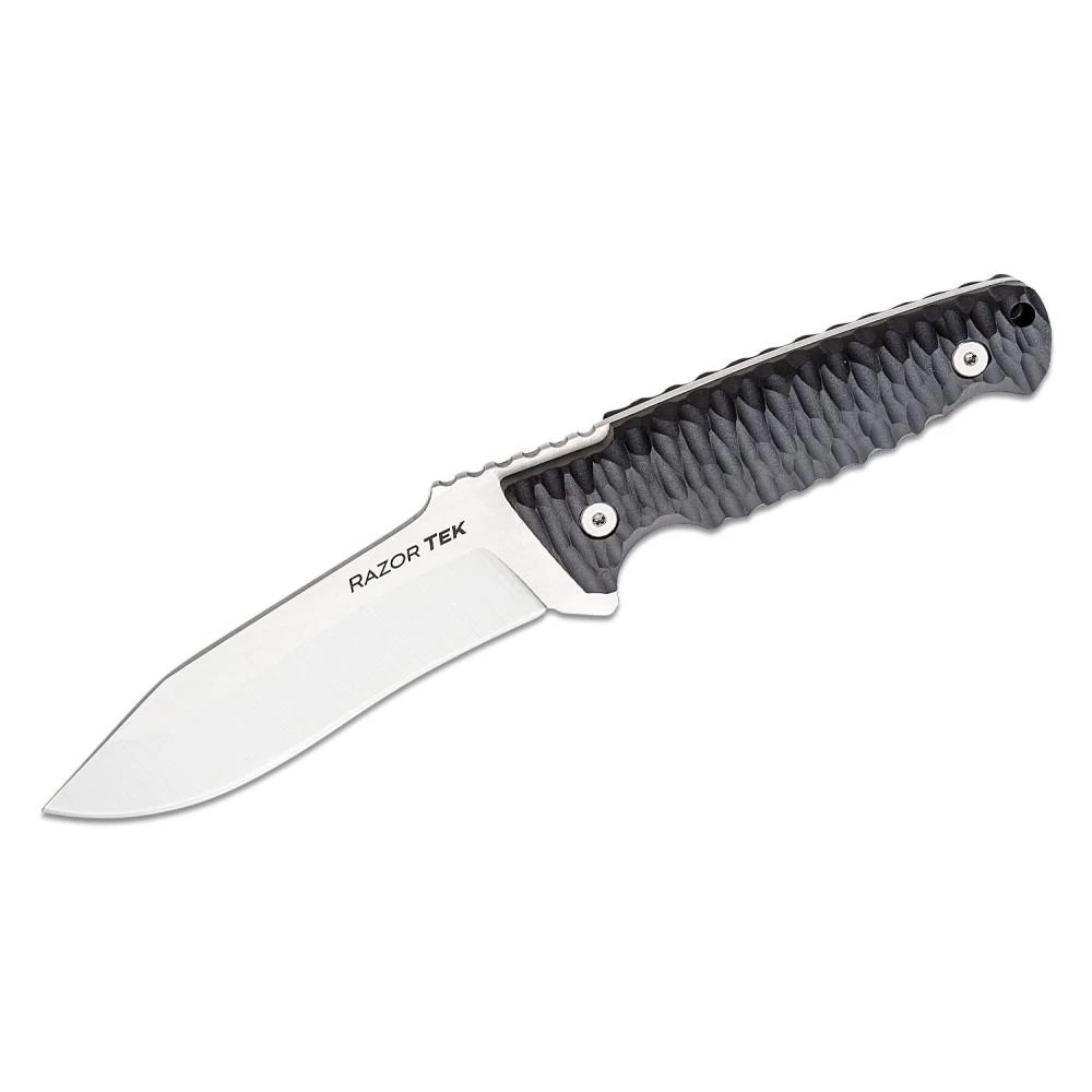 The next step up in the Razor Tek series features a 5” recurve blade. A recurve blade gives the benefits of a longer cutting edge and belly at the front. This blade shape offers the benefits of cutting when drawing or pulling the blade through. A great mid size fixed blade for game processing, Bushcraft, food prep, chopping and slashing. Combining the blade shape with a highly ergonomic, textured grip this knife is ready for your next outdoor adventure. Includes Secure-Ex sheath.