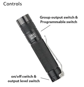 - Switch between output level – With the flashlight on, slightly press the switch and release (within 1s) to switch to the next output.