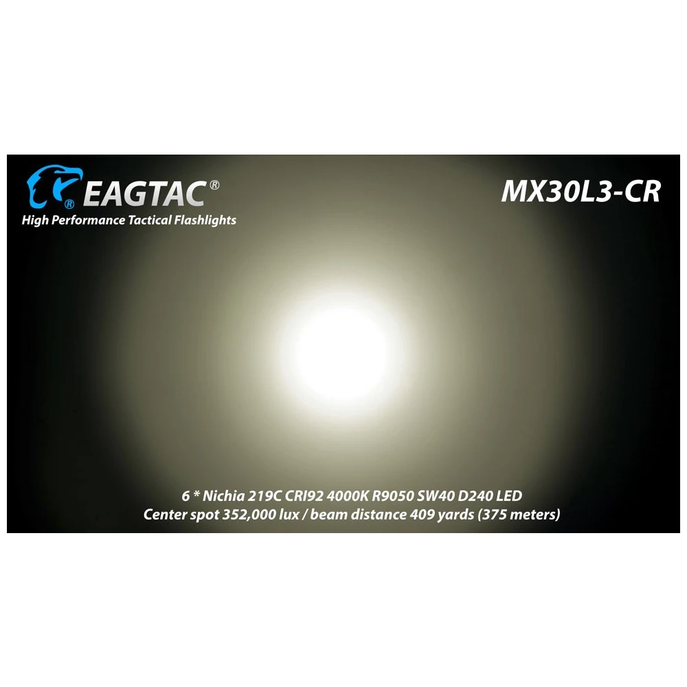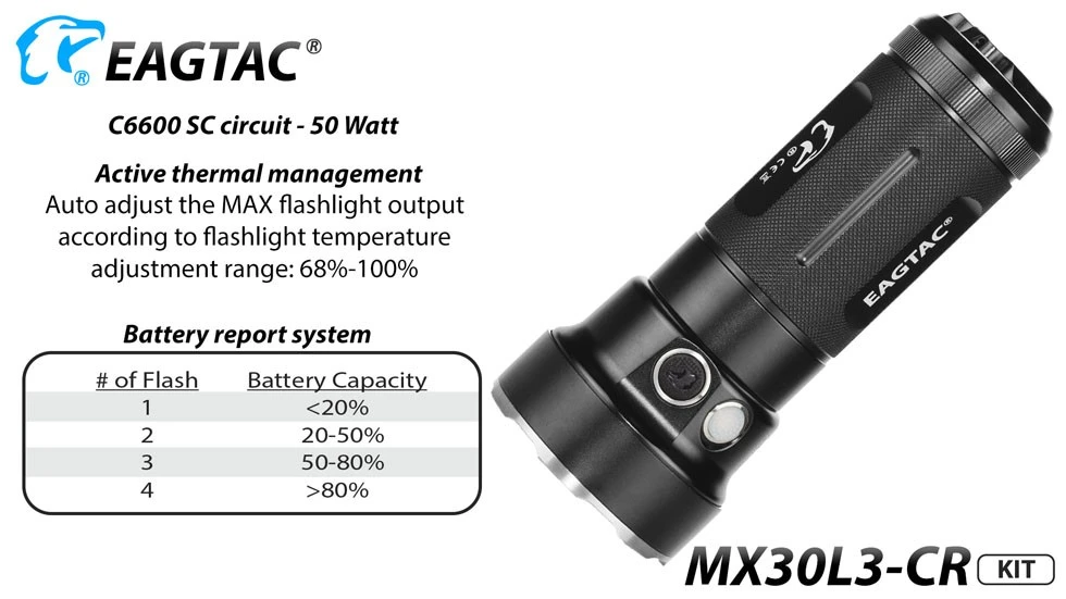 - MX30L3CR has 5 brightness levels and 3 special modes (strobe, SOS, emergency beacon).