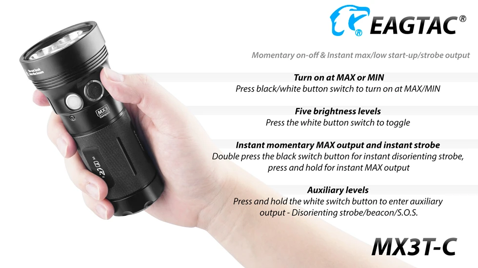 Three hidden auxiliary outputs: Disorienting Strobe/Beacon (1.67Hz)/S.O.S.