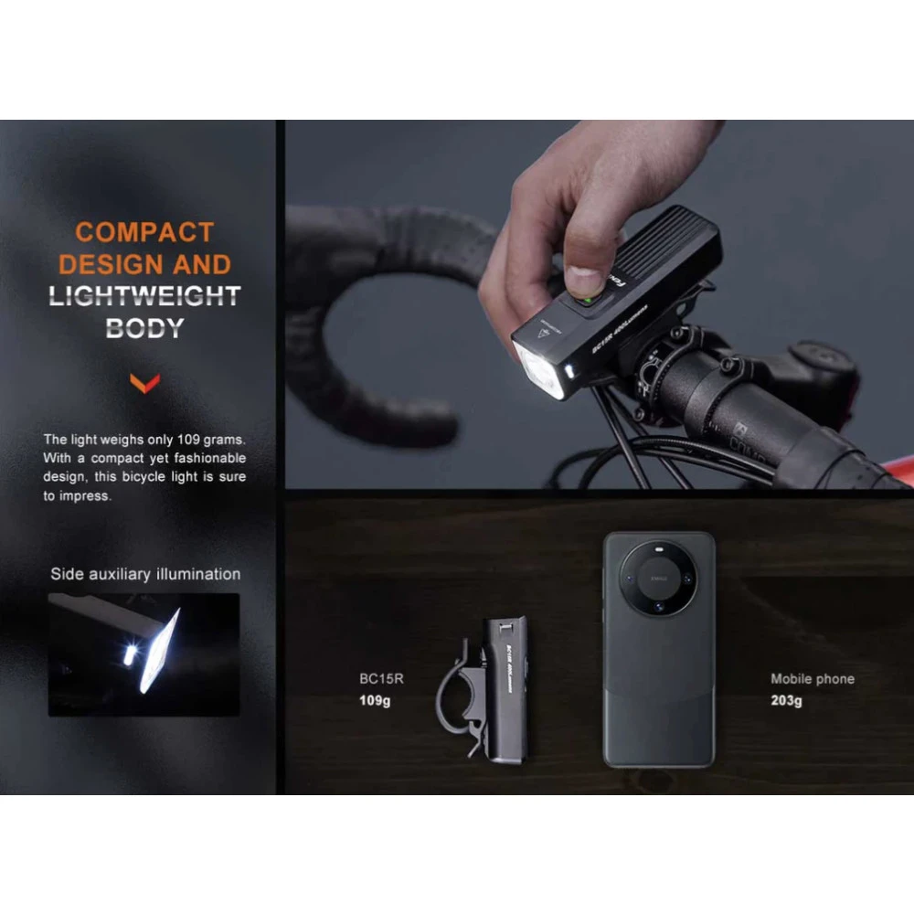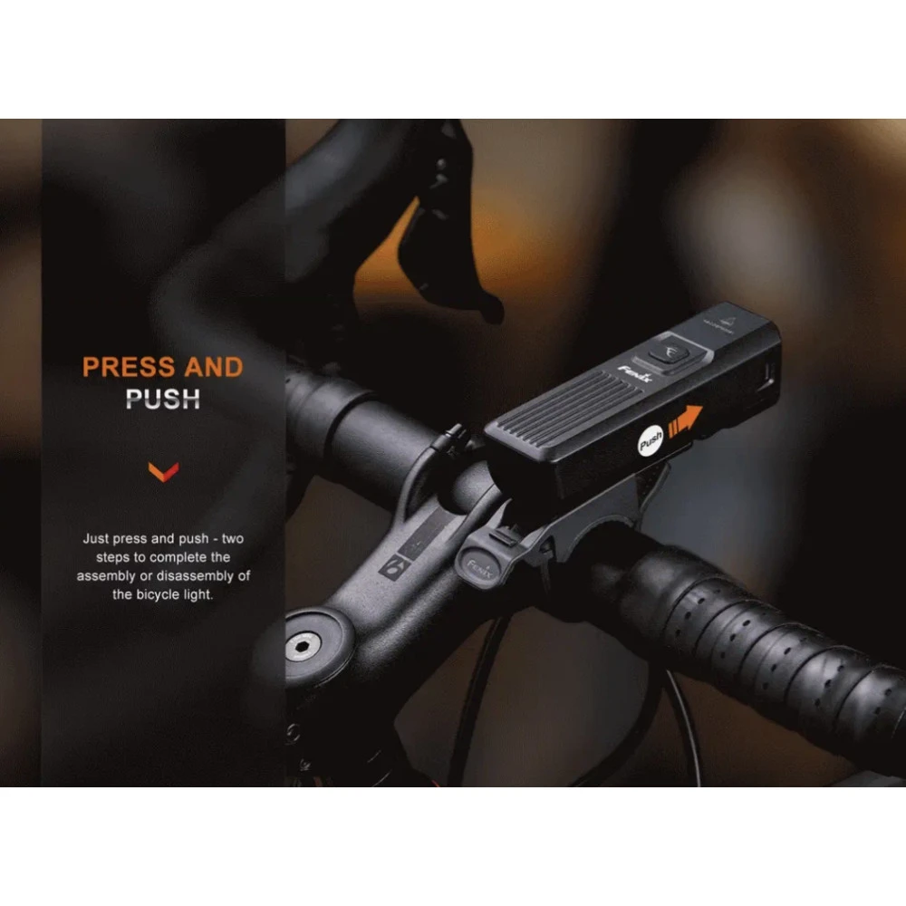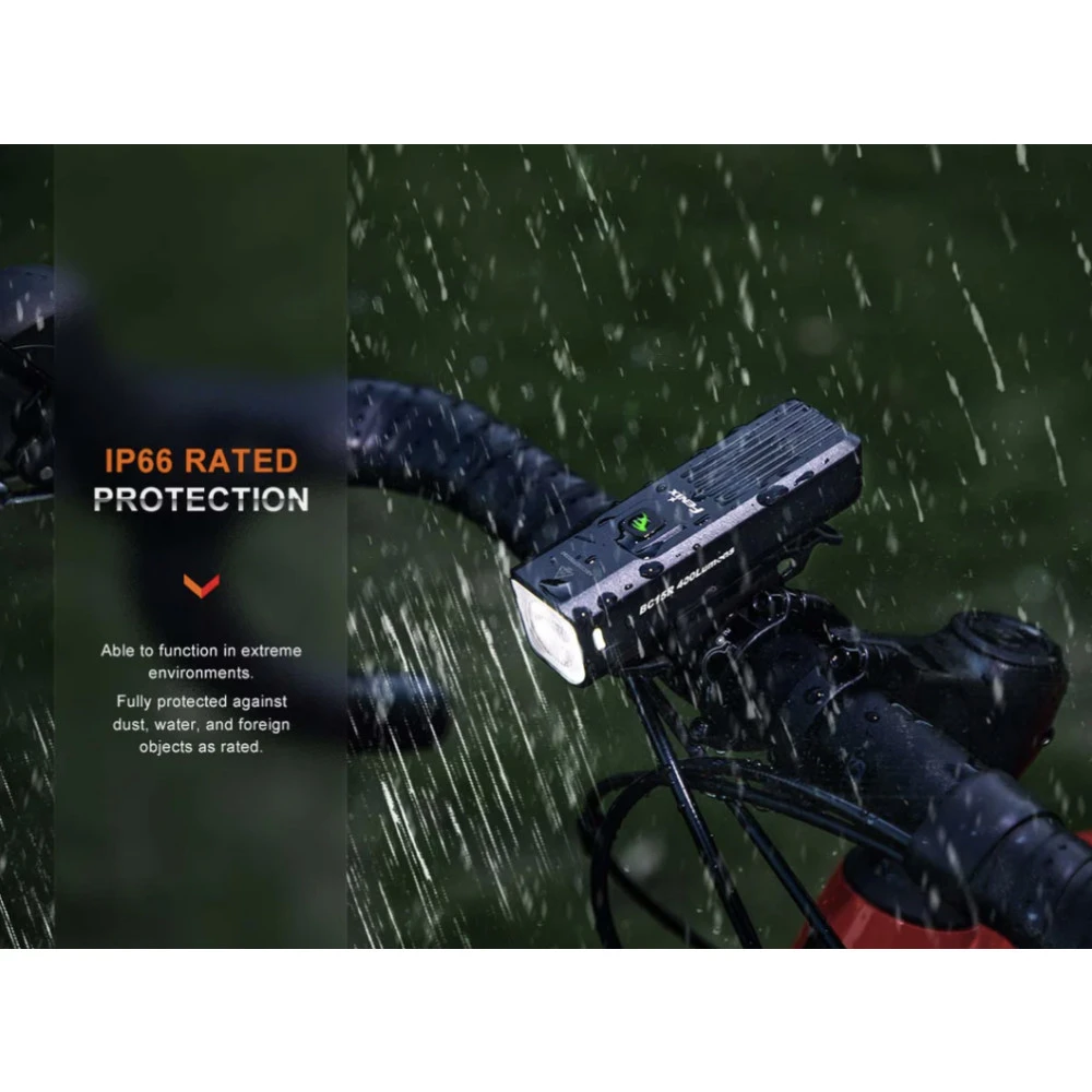 The Fenix BC15R is a lightweight bicycle light that can deliver a maximum 400 lumens from the built-in 2600mAh battery. It is Type-C rechargeable, and extremely easy to install and operate. The anti-glare cut-off facula works like a modern car headlight and cuts off the light at the top to avoid blinding oncoming traffic or pedestrians, making it much safer for commuting. It offers three brightness levels and a flashing mode for added rider safety. The quick-release bike mount makes it easy to quickly mount or dismount the light. Simply push to mount, and press and pull to release. Heavy rain resistant and impact resistant, this bicycle light will perform even in the harshest conditions.