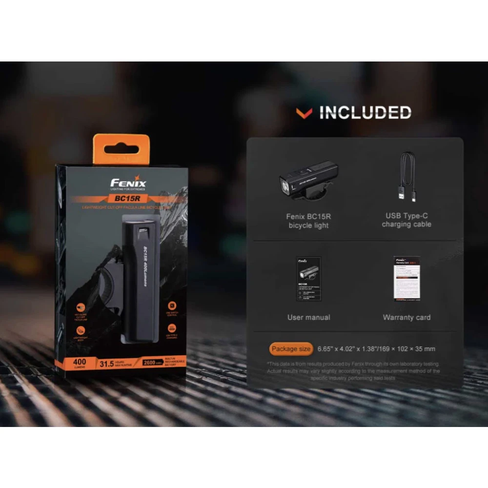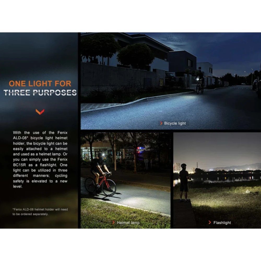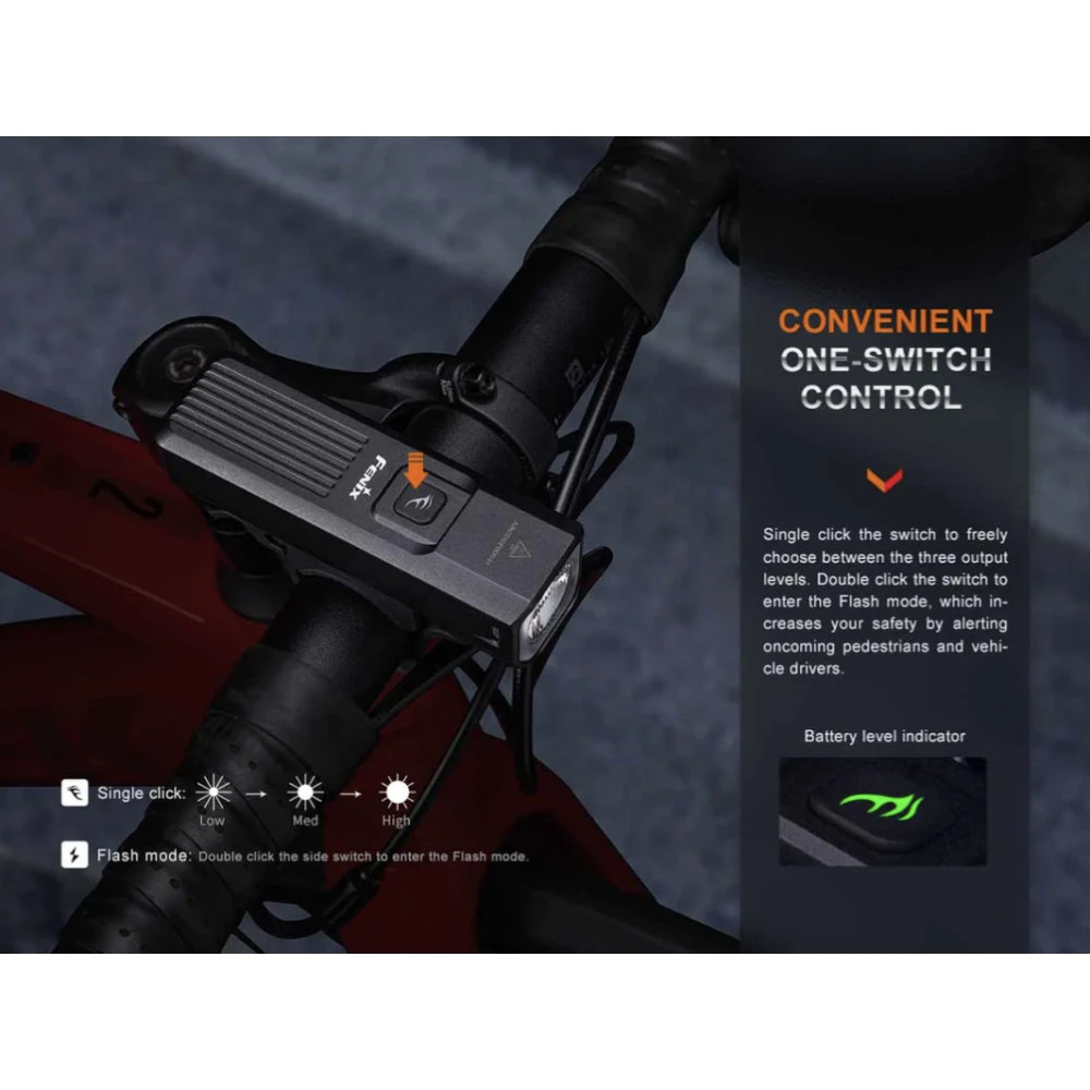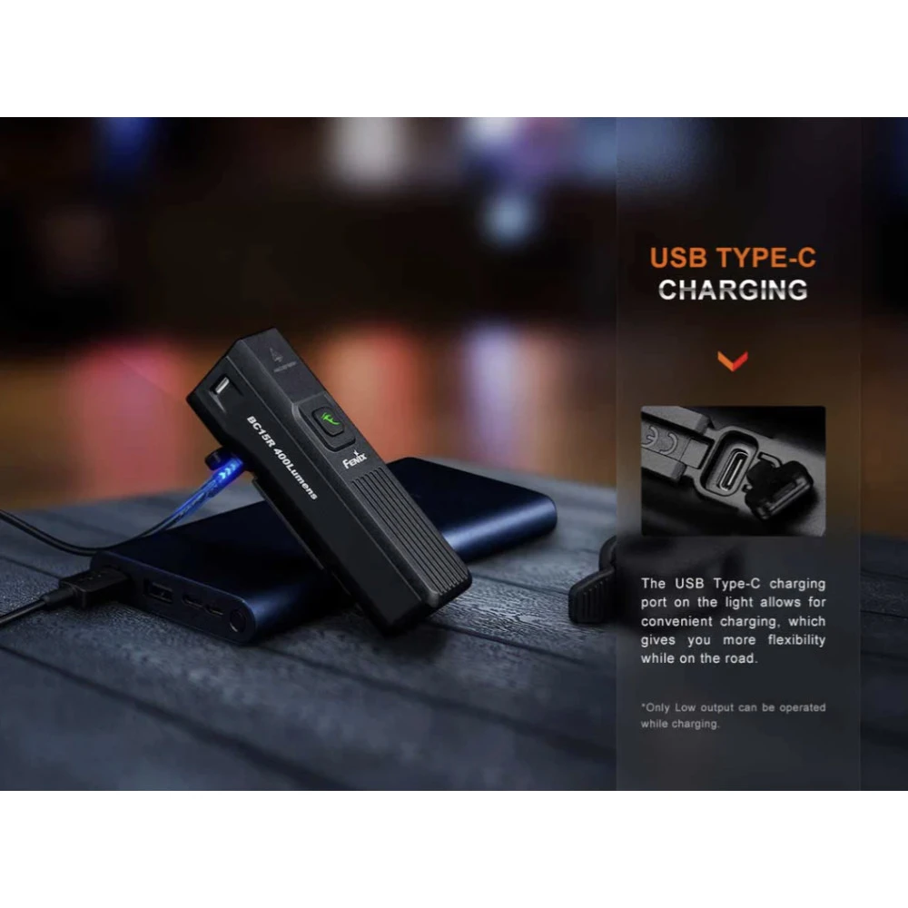 The Fenix BC15R is a lightweight bicycle light that can deliver a maximum 400 lumens from the built-in 2600mAh battery. It is Type-C rechargeable, and extremely easy to install and operate. The anti-glare cut-off facula works like a modern car headlight and cuts off the light at the top to avoid blinding oncoming traffic or pedestrians, making it much safer for commuting. It offers three brightness levels and a flashing mode for added rider safety. The quick-release bike mount makes it easy to quickly mount or dismount the light. Simply push to mount, and press and pull to release. Heavy rain resistant and impact resistant, this bicycle light will perform even in the harshest conditions.