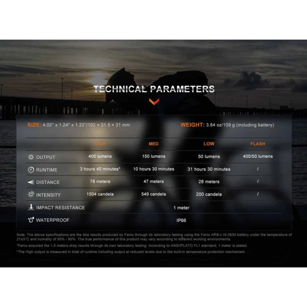 - 400 lumens maximum output and 78 metres maximum beam distance.