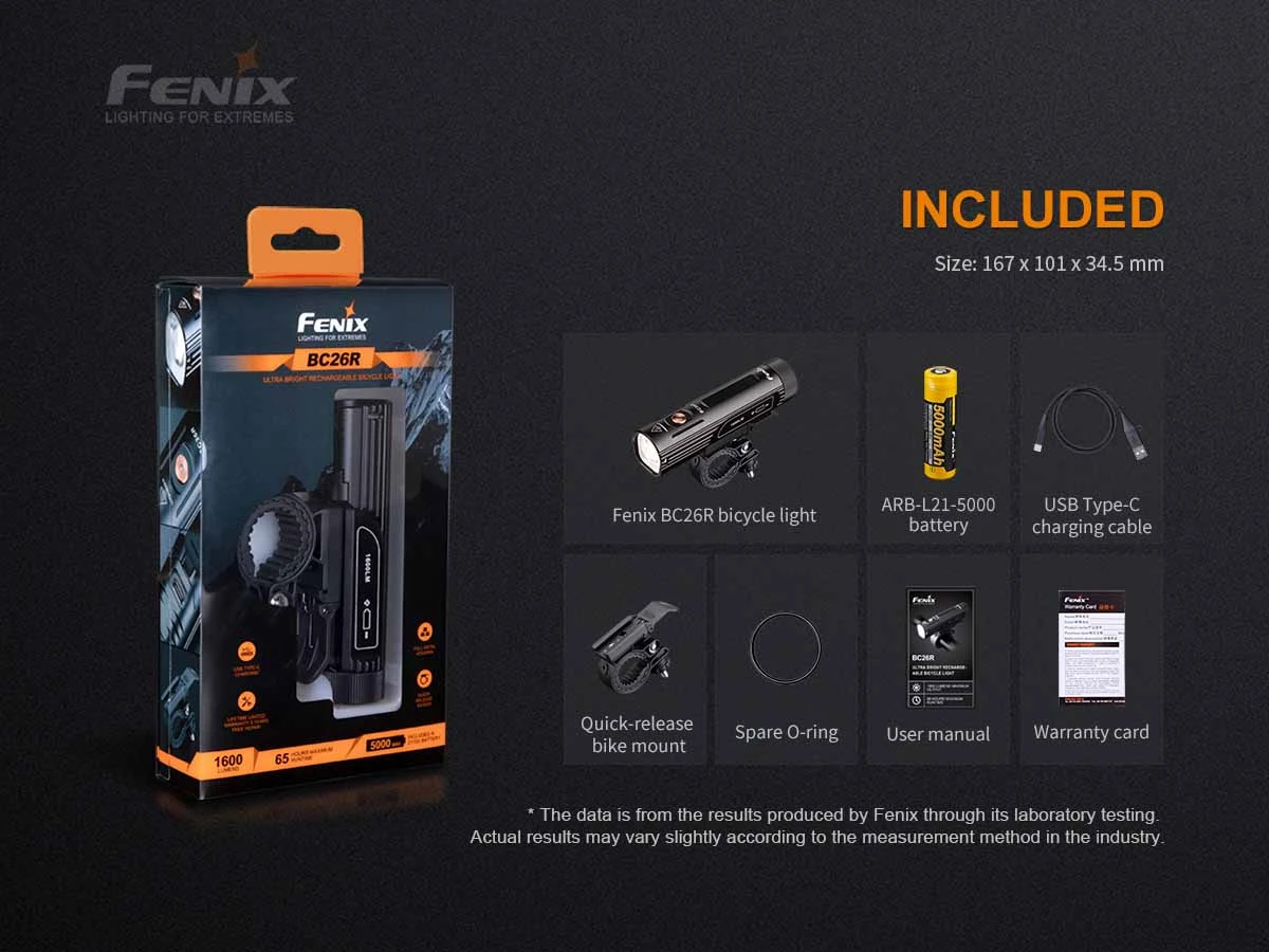 The Fenix BC26R is a lightweight, bike light featuring an included rechargeable 5000mAh li-ion battery that blasts up to 1600 lumens and allows for longer runtimes— up to 65 continuous hours on the lowest brightness level. The 100° floodlight beam offers a wider field of view making it much easier to see while turning corners. Attach and remove the bike light quickly with the included quick-release bike mount. And never fear the elements with dustproof, waterproof and shockproof design.