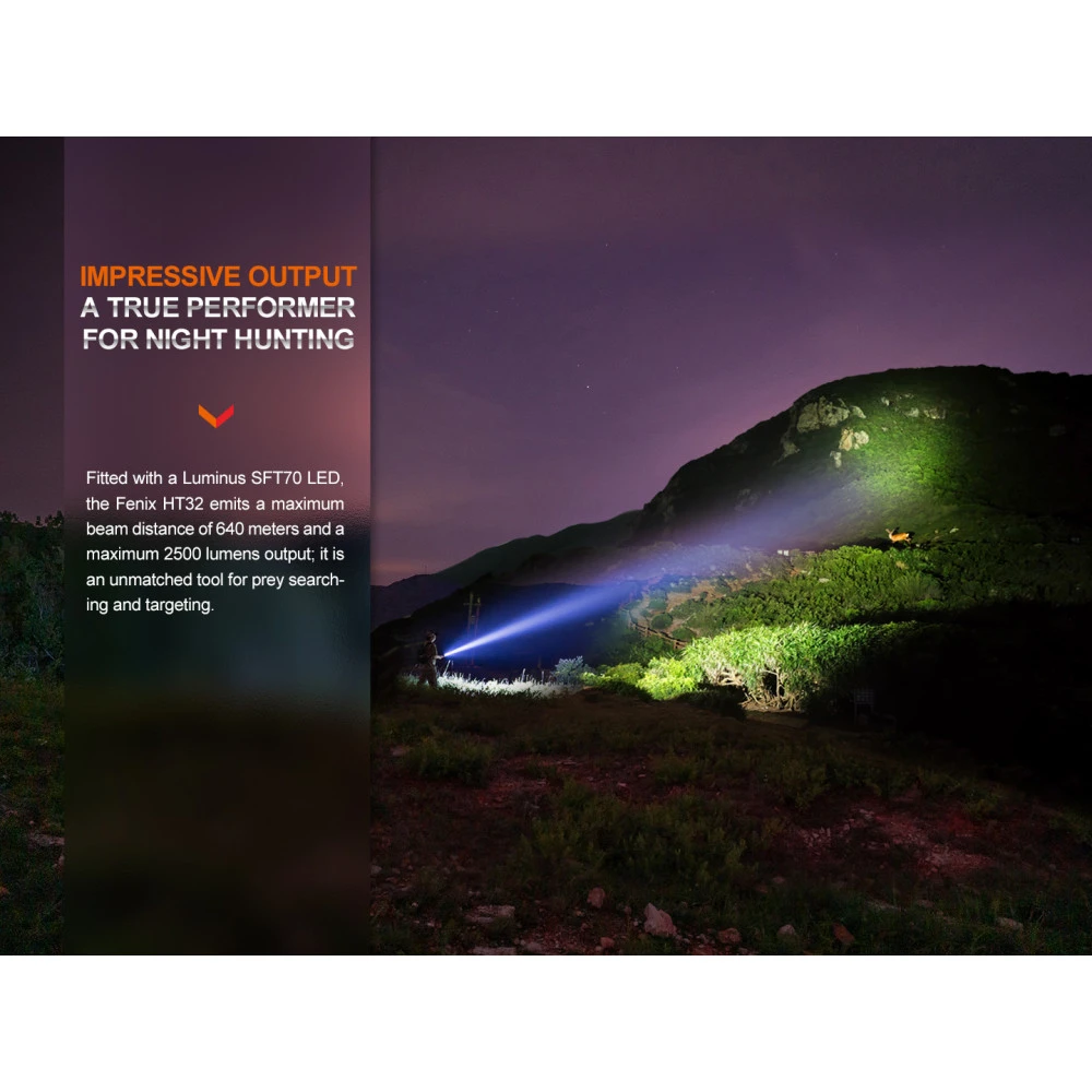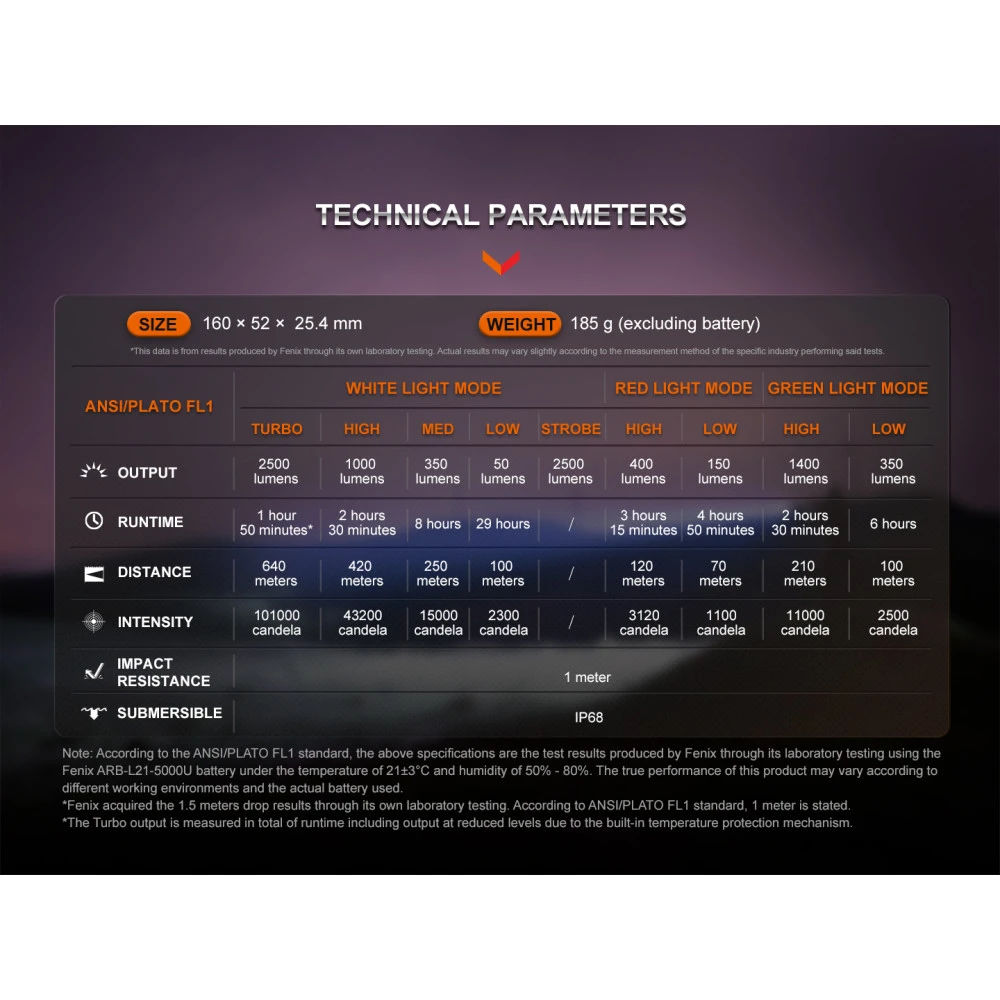 - 1 x Luminus SFT70 white light LED with a lifespan of 50,000 hours. which delivers a max output of 2500 lumens and a max beam distance of 640 metres