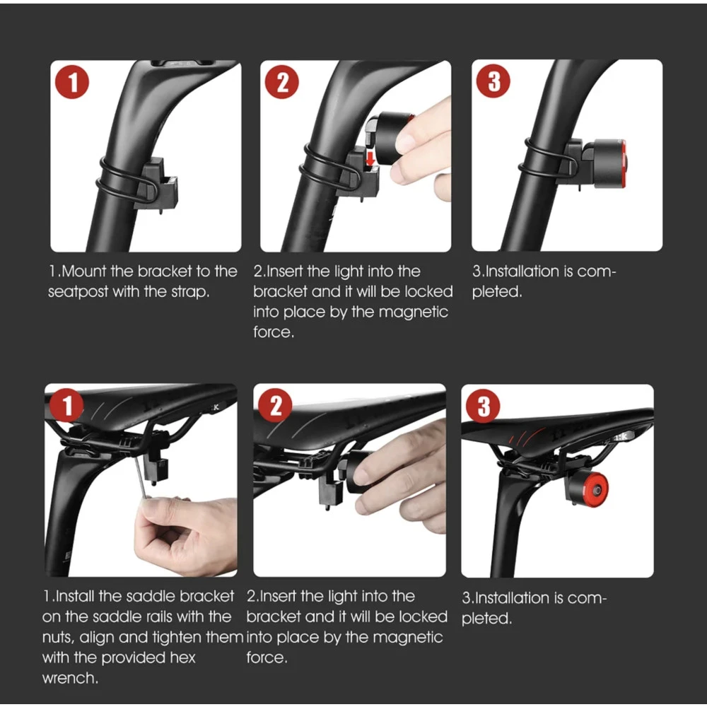 Gaciron LOOP-100 smart brake tail light is a rear light and brake light in one. A motion sensor registers when brakes are applied, which then triggers the brake light. In addition to the braking sensor it has a handy battery indicator which provides a rough idea of how much runtime remains. It features six modes, three of which emit a steady light at differing levels of brightness, with the other three being flashing modes. Trail mode is a quick bright flash, Power Saving is a low slow flash, while Fog Light is somewhere between the two. While the ‘brake’ light is 100 lumens, Gaciron doesn’t list the strength of the other modes, but they’re bright enough to maintain visibility in varying weather conditions. The brake sensor functions in any of the six settings, and is brighter than any of the modes, so that braking is always obvious. LOOP-100 charges via USB-C in 2.5 hours, with the on/off switch turning blue to indicate it’s fully charged, and battery life varies between 5.5 and 40 hours, depending on which mode it is in, and also depending on the amount of braking. It also features a sleep mode, where the light automatically shuts off after two minutes, when no movement is detected, and as soon as movement is detected, it automatically switches itself back on. The LOOP-100 comes with two magnetic mounting options: a tool-free option that attaches to the seatpost, and a bracket that fits under the saddle.