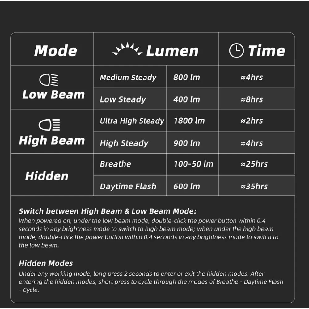 Hidden Daytime Flash Mode: 600 lumens – ~35hrs