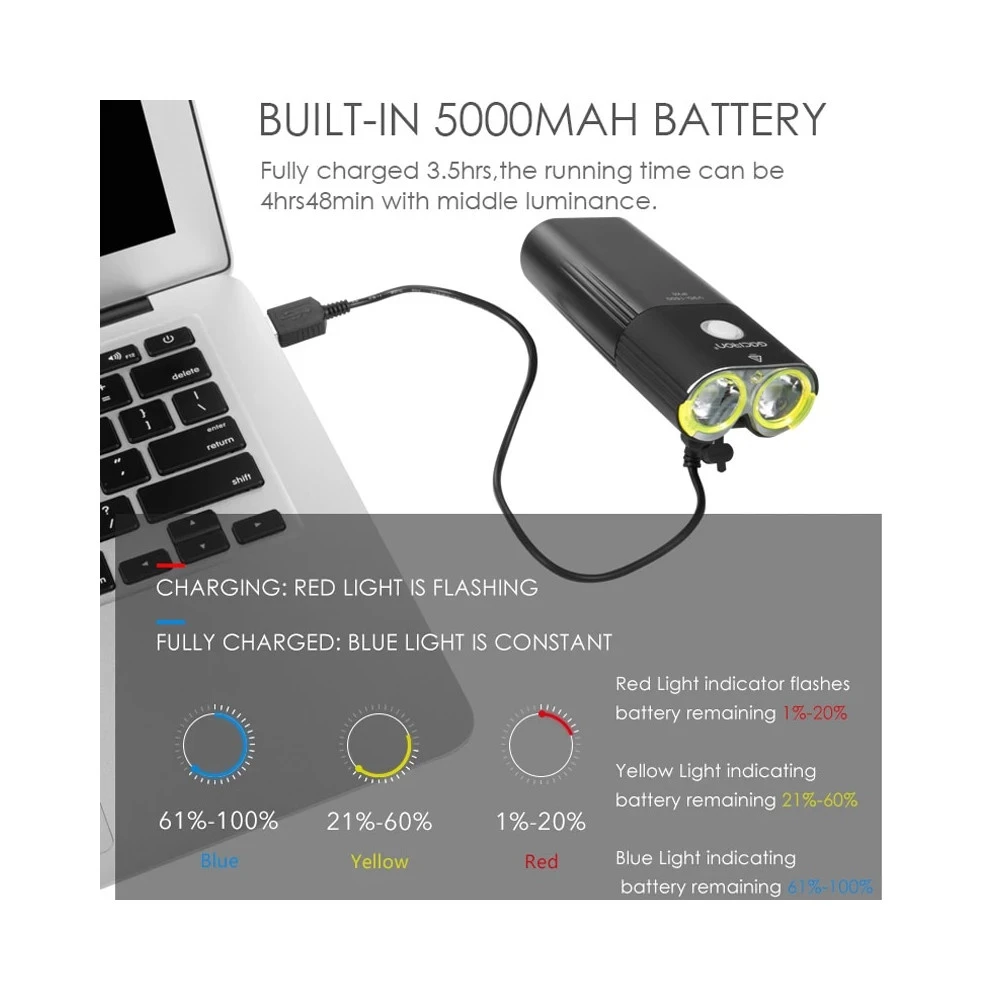 - USB rechargeable built-in battery 5000mAh (2x 18650 2500mAh)
