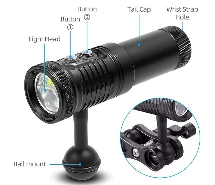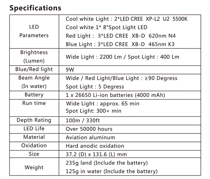 The V17 2200 lumen focusable diving light from H-Max comes with an innovative Auto Flash-Off function, giving better control over lighting and preventing the spot light from spoiling the shots. It has a wide angle of 90 degrees, and comes with a heavy-duty 26650/4000mah rechargeable battery (also with its own charger supplied). Maximum operating depth of V17 is 100m. Switching modes is easy, moving from wide, spot, red light, blue light, and red+blue light, at the touch of a button. Switching brightness levels from 100% to 50% to 25% is just as straight forward with the touch of a button.