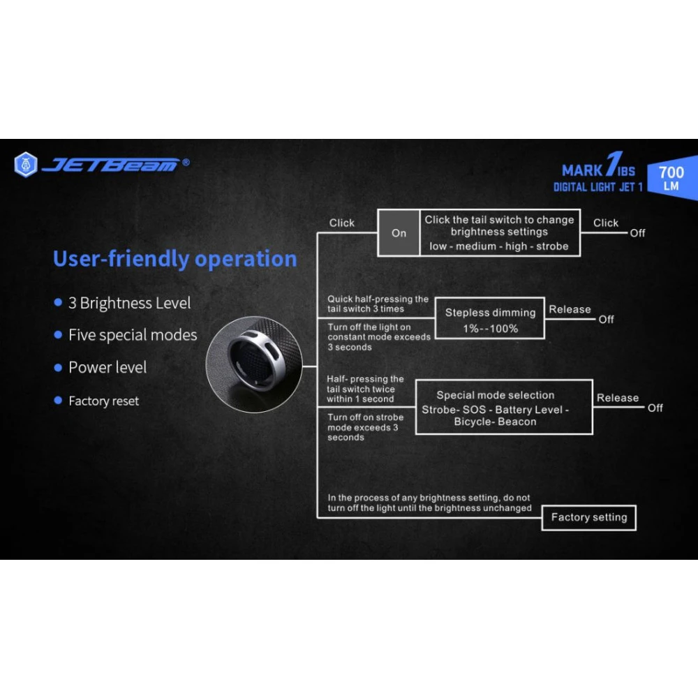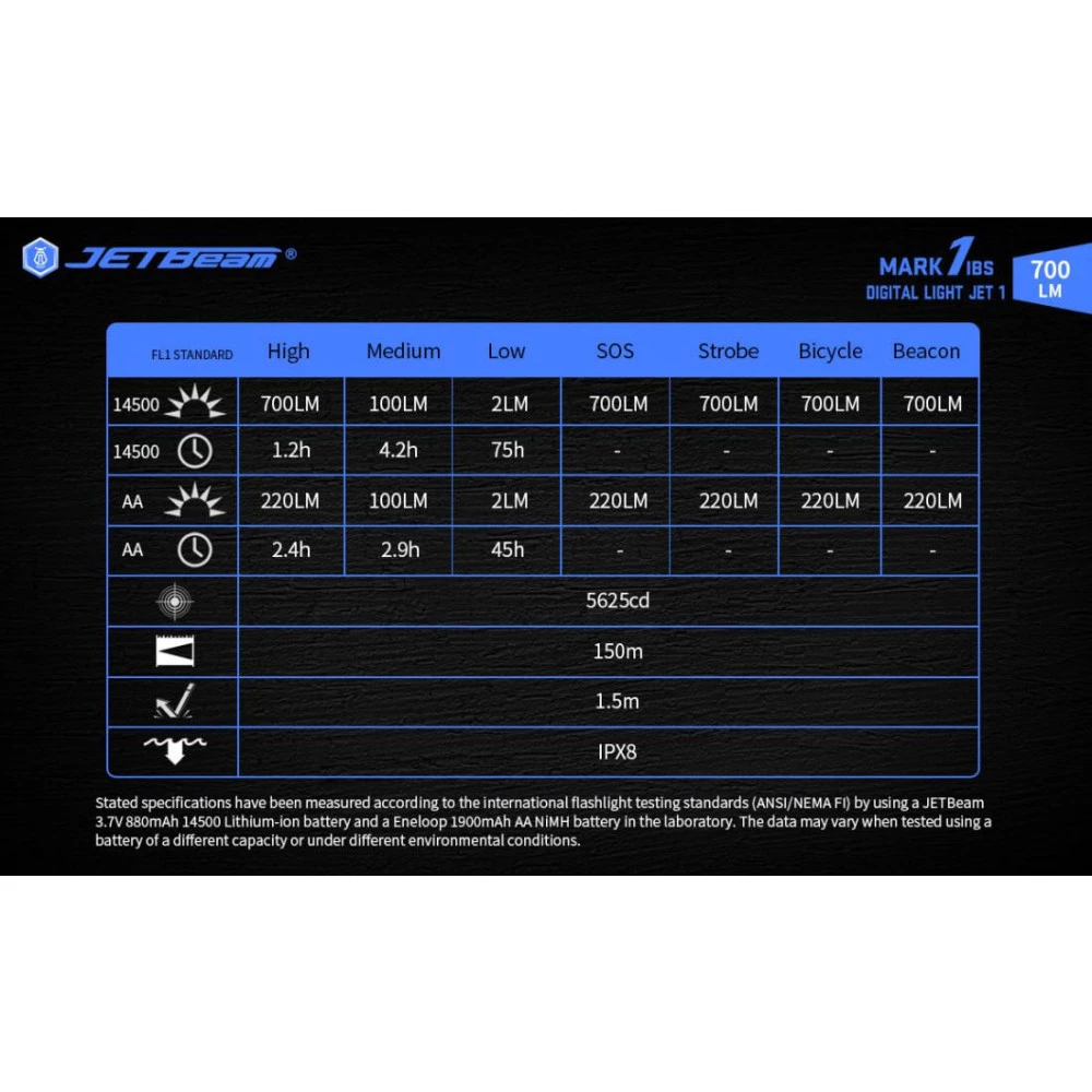 HIGH – 700 lumens, 1.2 hrs