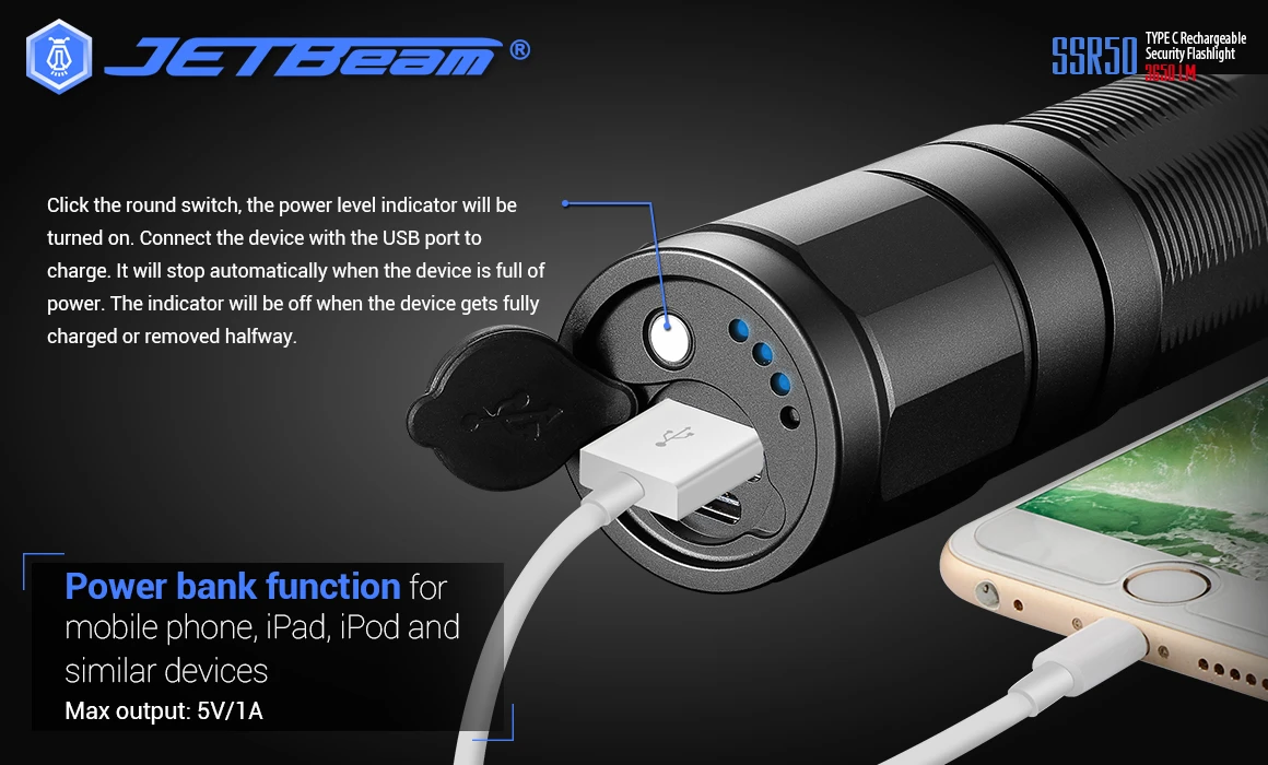 - Powerful power bank function for mobile devices, tablets and more