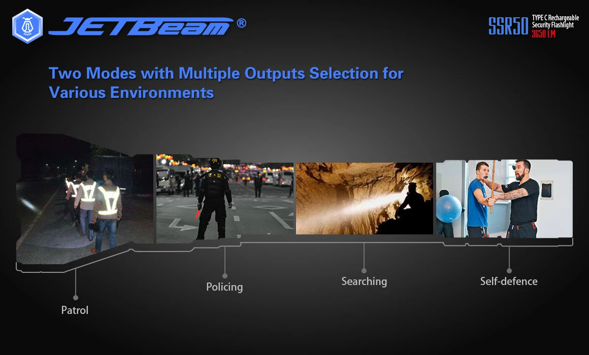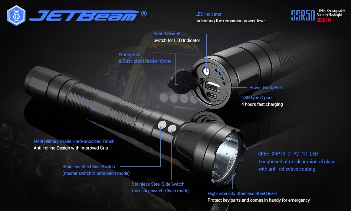 - Convenient dual side switches with 5 light levels, strobe and SOS