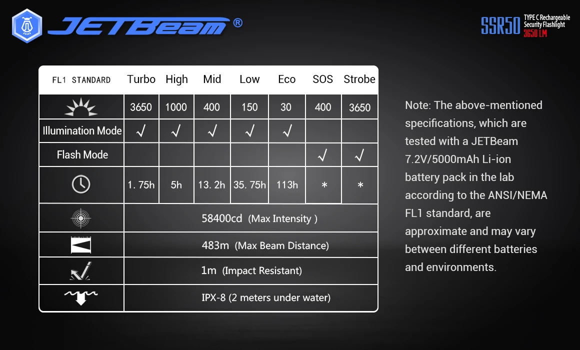 - Turbo 3650 Lumens – 1.75 Hours