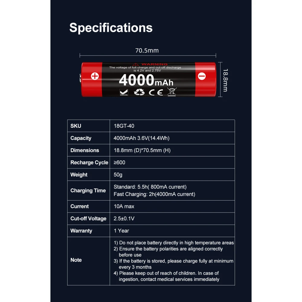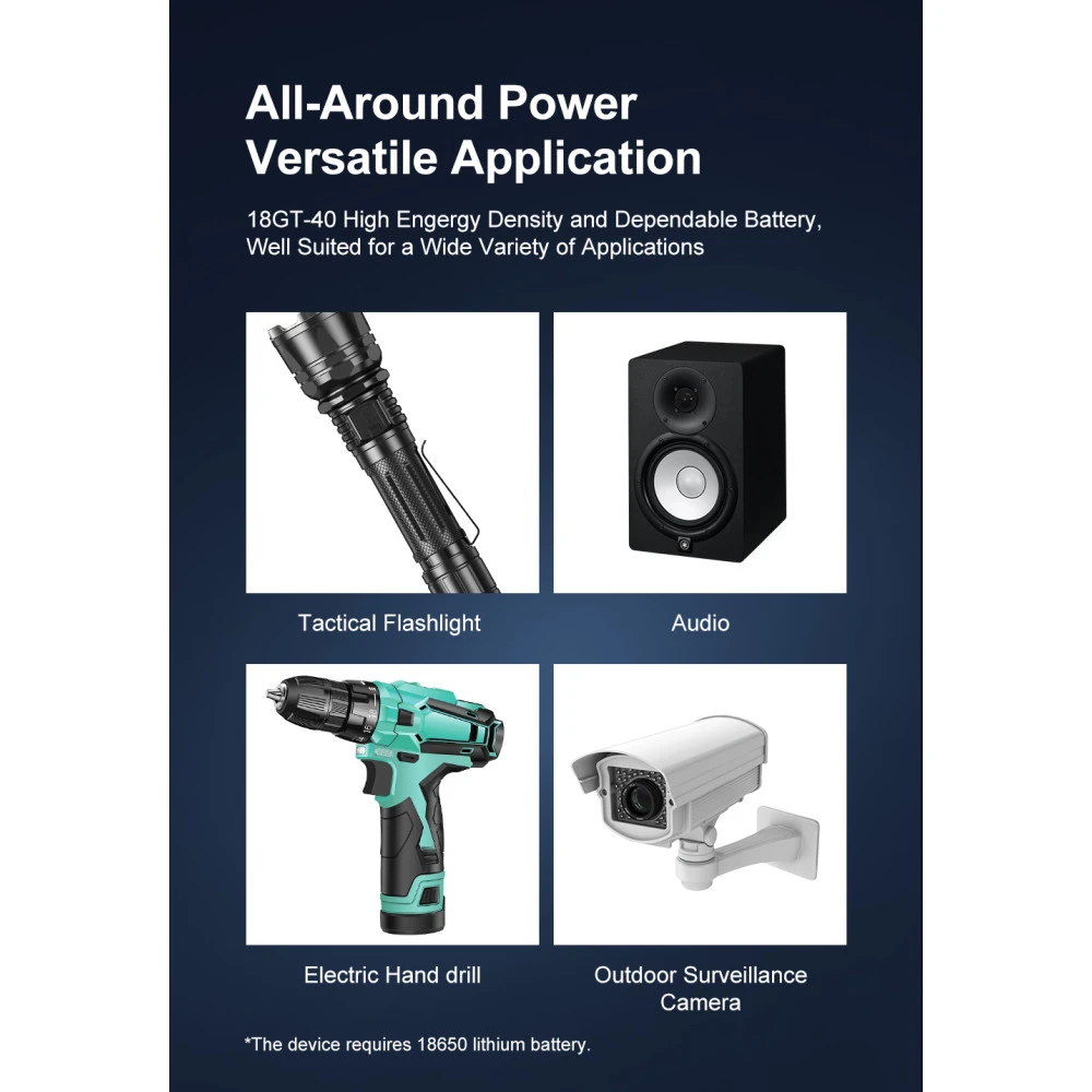For maximum performance and reliability: The Klarus 18GT-40 18650 rechargeable 4000mAh Li-Ion battery is ideal for the Klarus XT12GT and XT2CR Pro. It is also great for powering other compatible 18650 powered items.