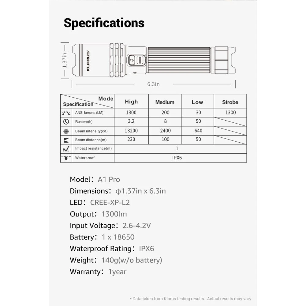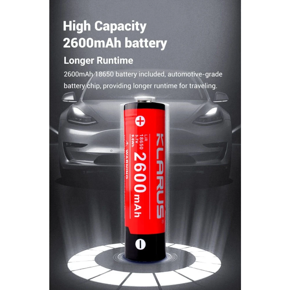 Runs On: 1 x Klarus 2600mAh 18650 battery (Included)