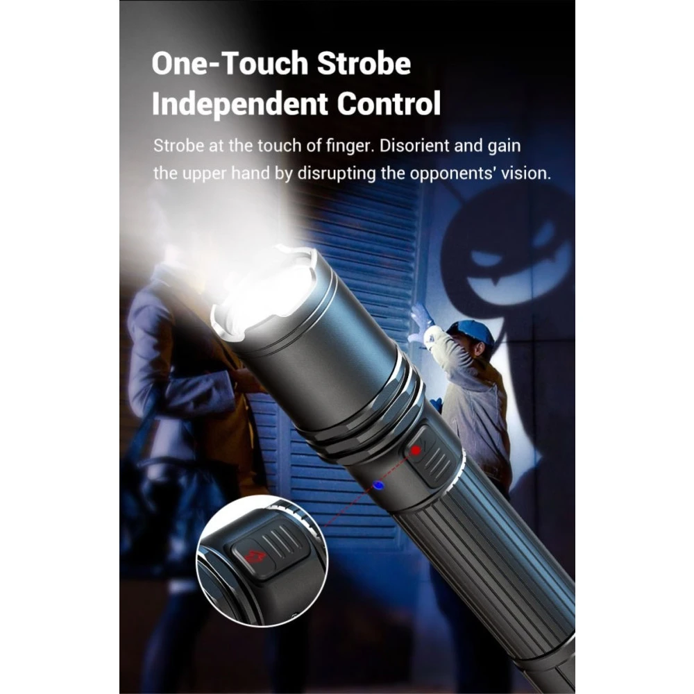 - Side dual-switch featuring tactical switch for one touch strobe and a mode cycle button