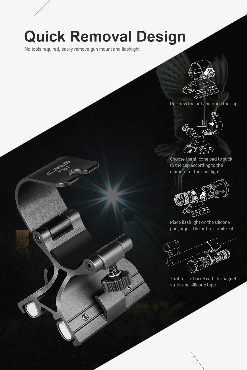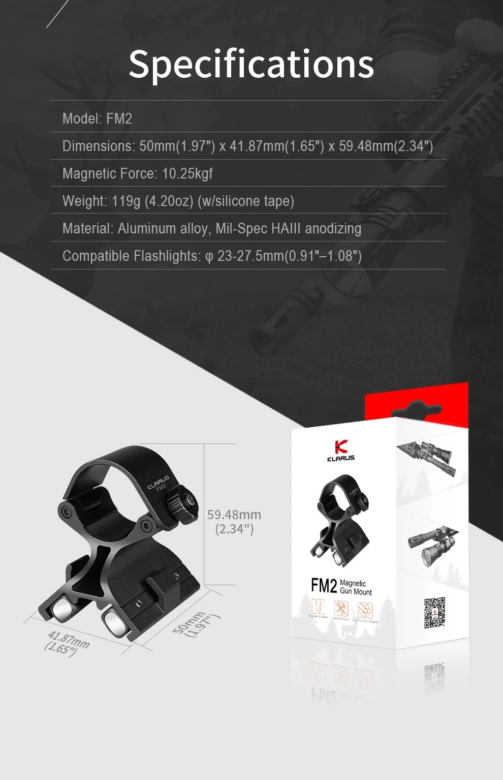 Klarus FM2 Magnetic Mount is constructed using Mil-spec HAIII anodised aluminium. It features quick and easy installation, a magnet with silicone lockout, anti-slip and scratch-resistant pad. FM2 is compatible with various size torches, 23-27.5mm diameter, by utilising the silicone pads.