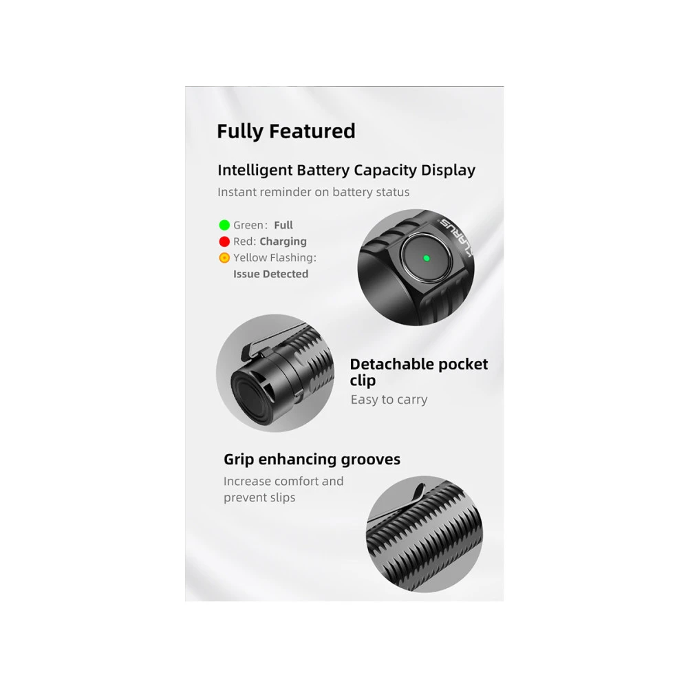 - Includes detachable pocket clip for simple carry on your belt, hat brim, or bag