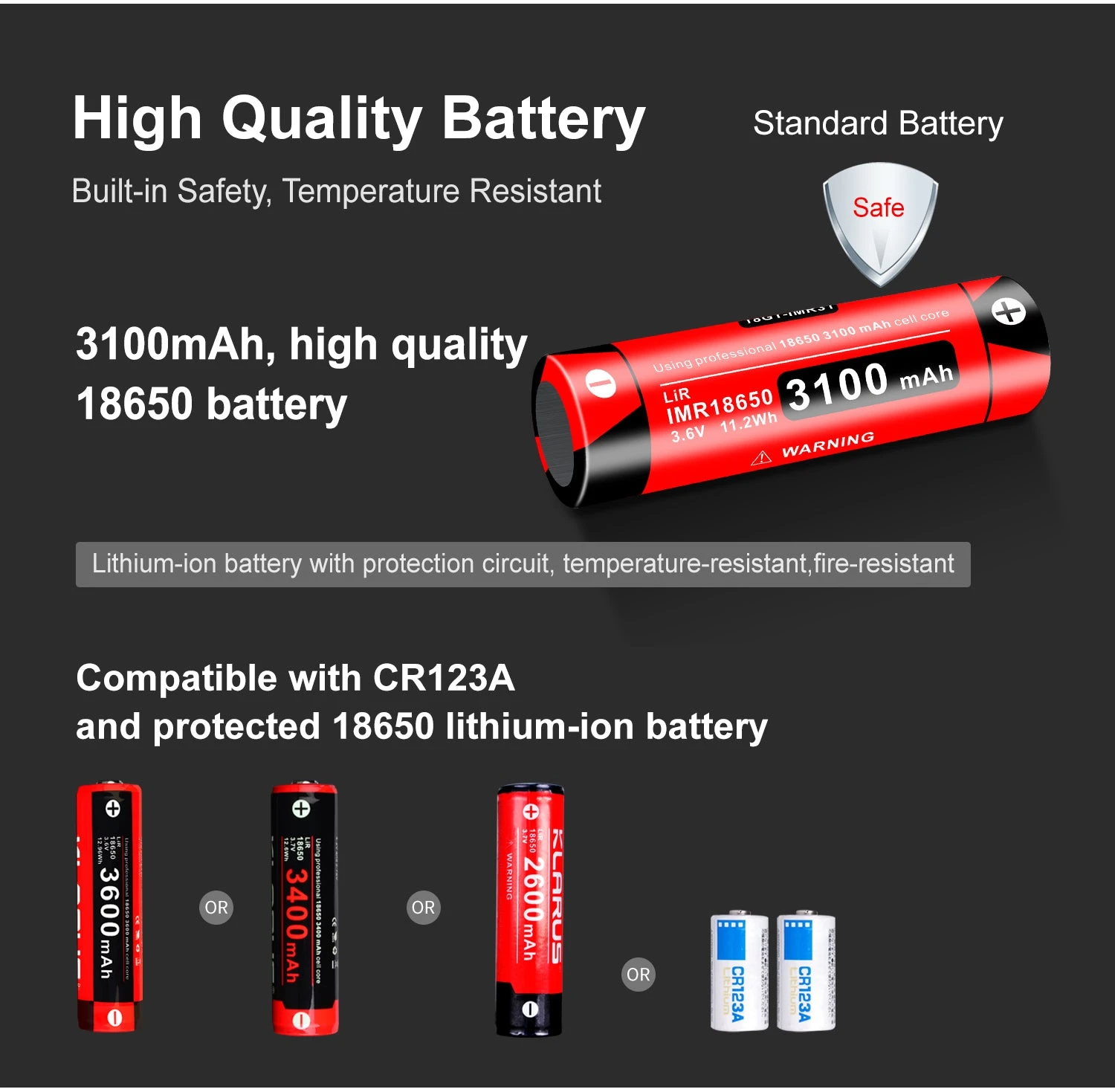 Runs On: 1 x 3100mAh 18650 Li-ion battery (included) or 2 x CR123A batteries