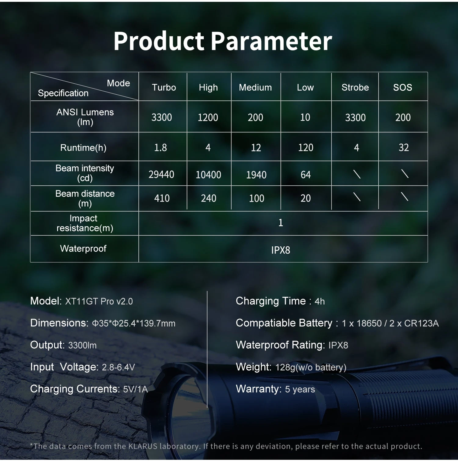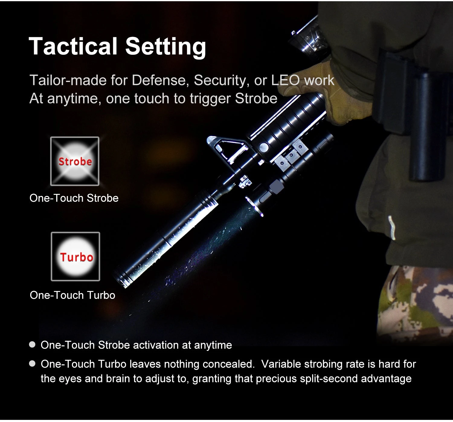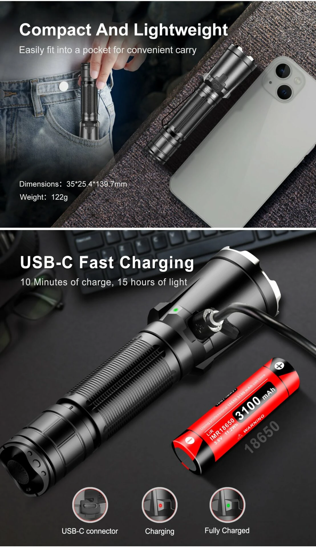 - Strobe: 3,300 Lumens – 4 Hours