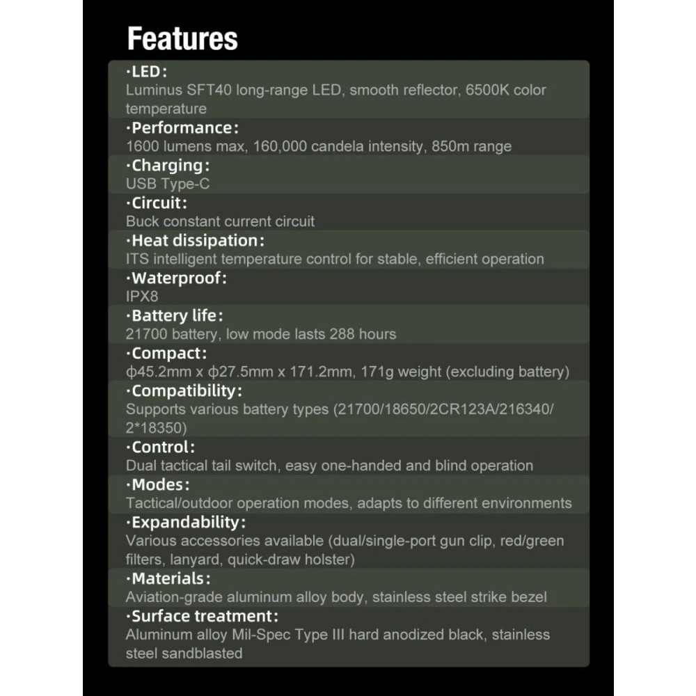 - Easy Interface: One-Touch Strobe; One-Touch Turbo; One-Touch Low; Mode memory; SOS; Capacity indicator,