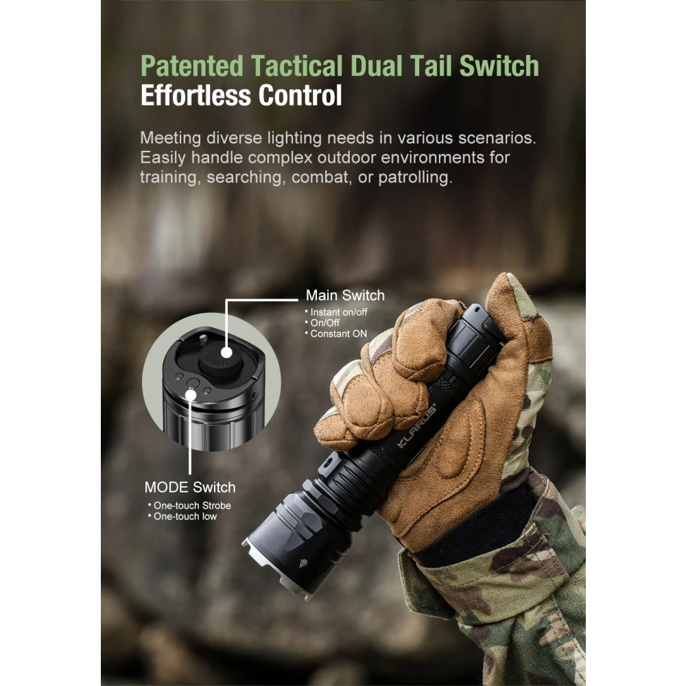 - Tactical Setting: Classic KLARUS XT series control. One-Touch Turbo; One-Touch Strobe; versatile in all tasks