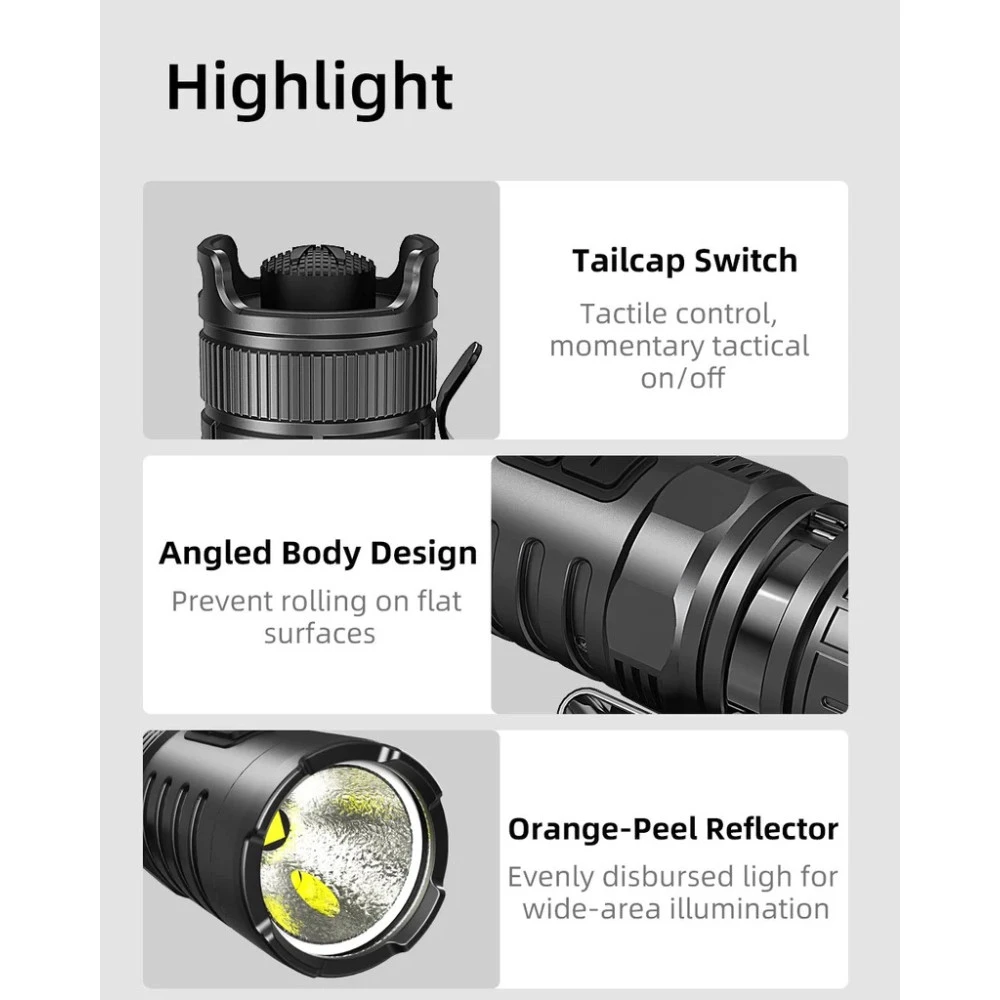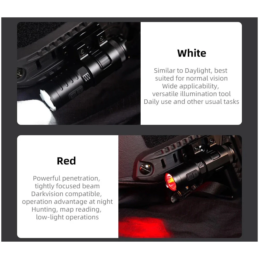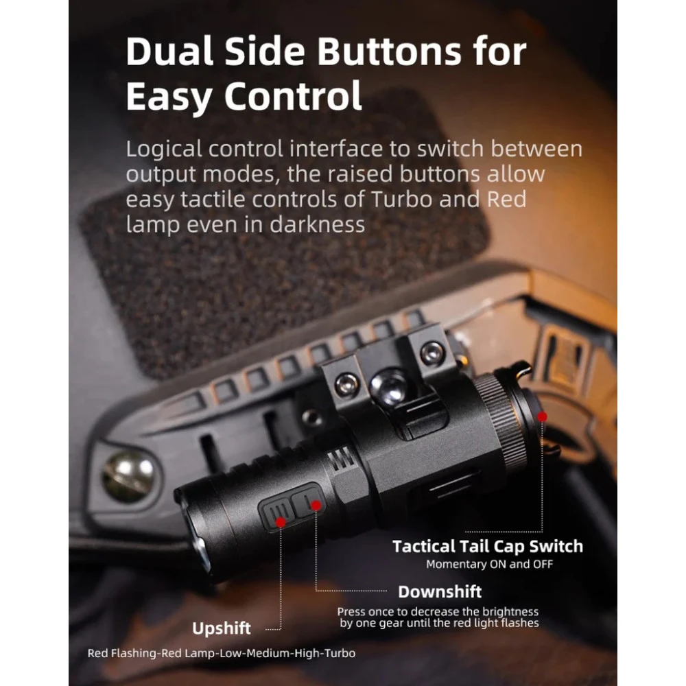- Logical Control Interface: Features a tactical tail cap switch for momentary ON and OFF, along with dual side-switches for easy mode switching.