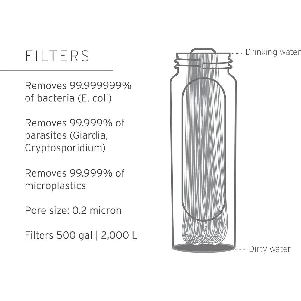 - Protects against 99.999999% of bacteria (including E.coli, Salmonella), 99.999% of parasites (including Giardia and Cryptosporidium), 99.999% of microplastics, silt, sand, and cloudiness