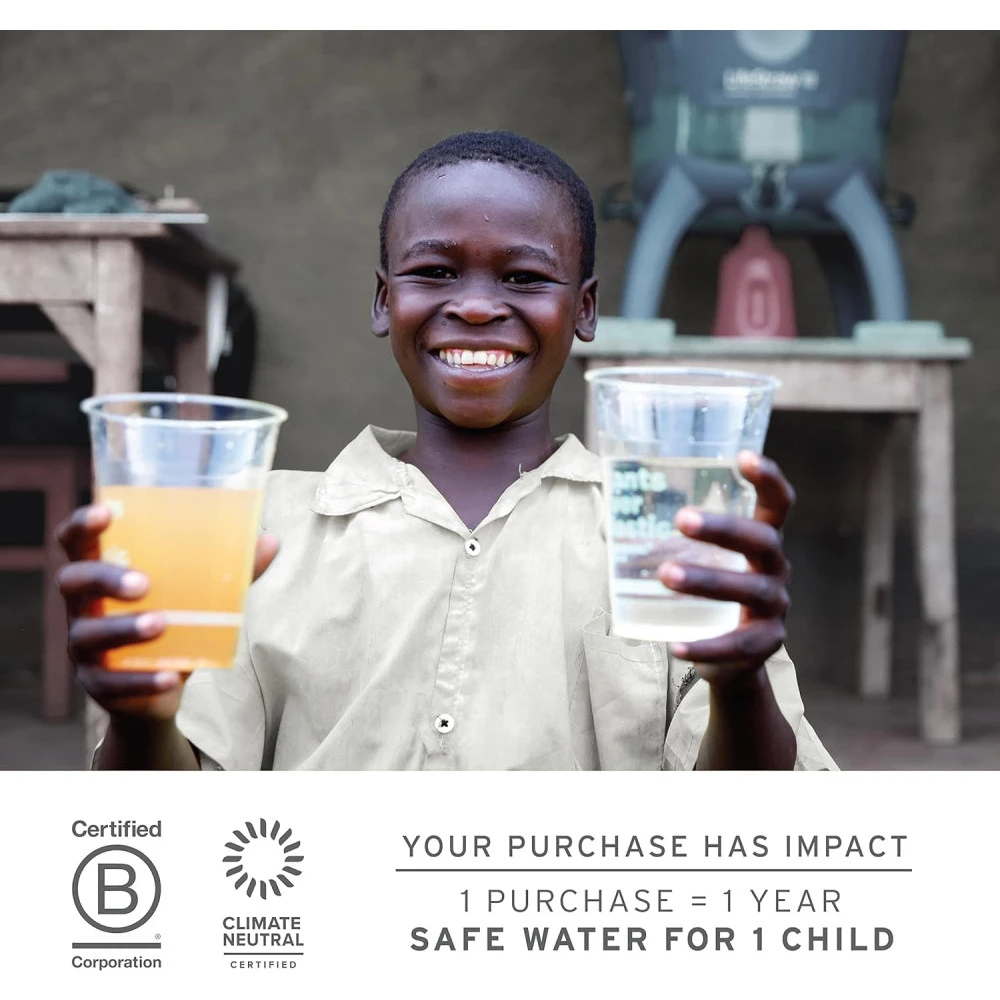 - Your purchase has impact: one purchase, one child, one year of safe water