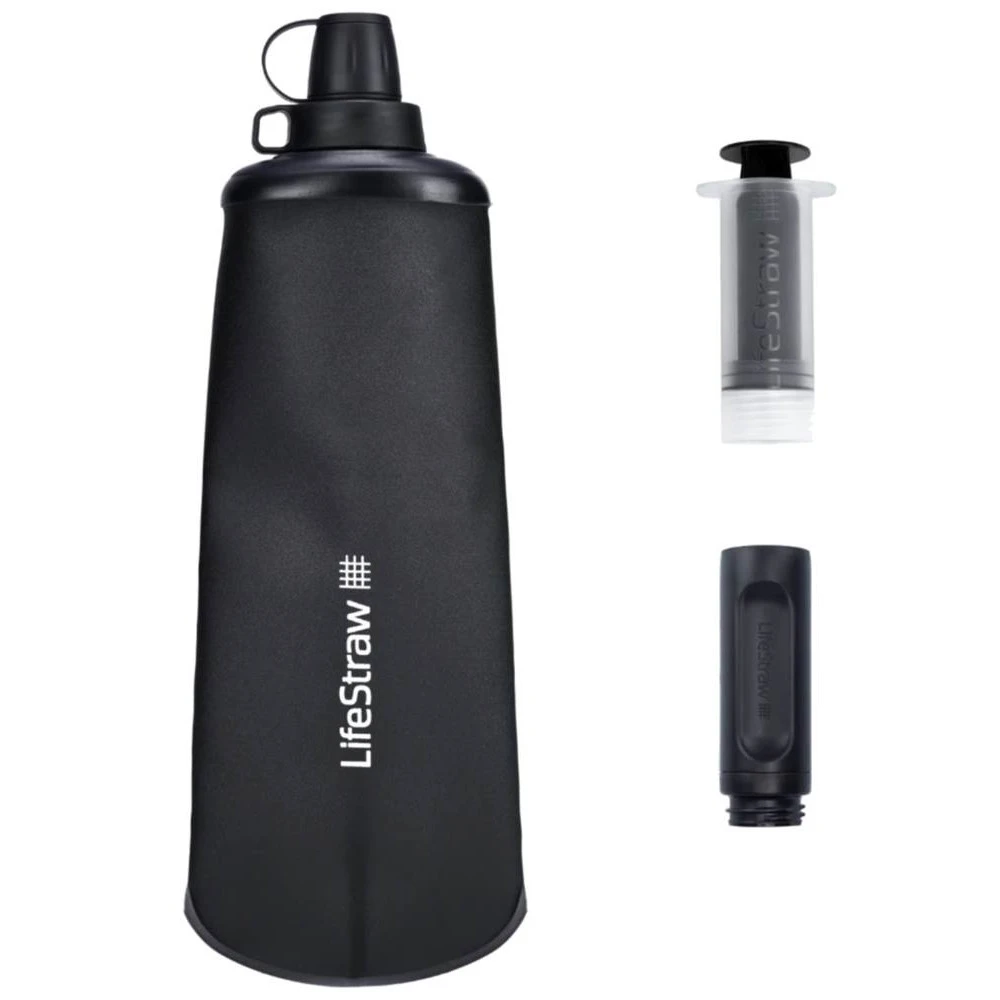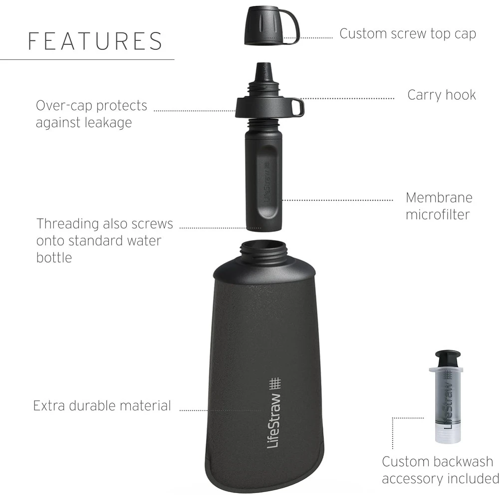 INCLUDES: LifeStraw Peak Series collapsible squeeze bottle with screw-top cap and tether, backwash accessory, user manual