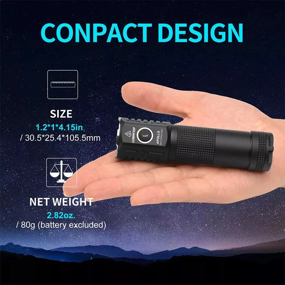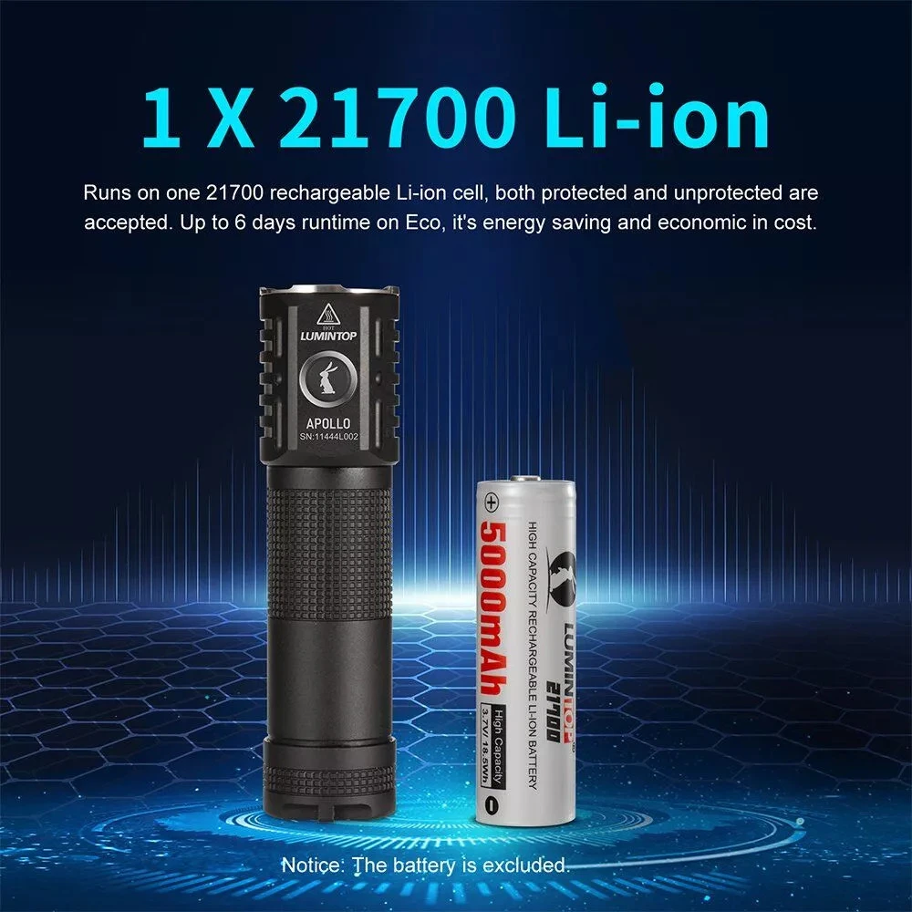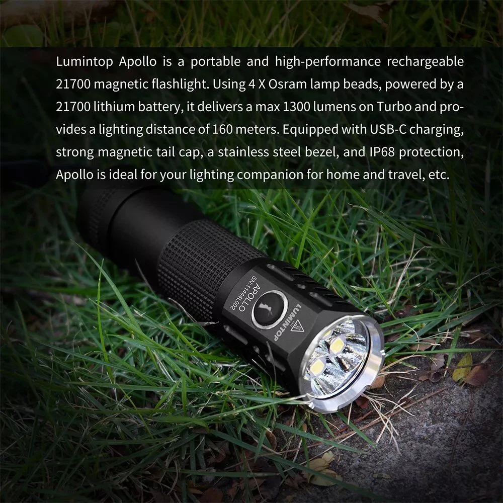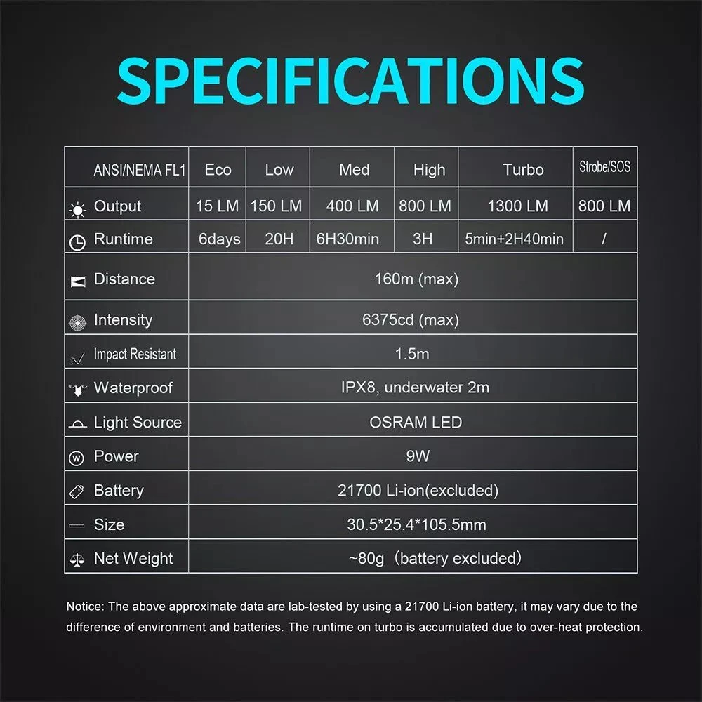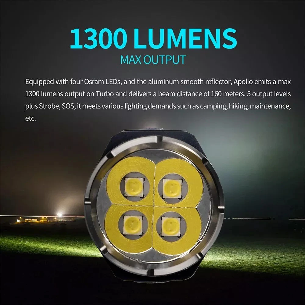 Turbo: 1,300 Lumens, Runtime of 5 min + 2h 40min