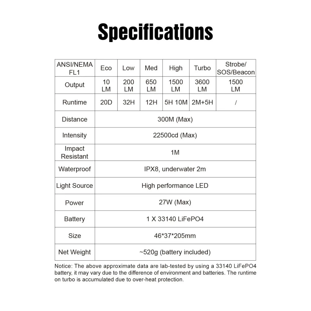Notice: The above approximate data are lab-tested by using a 33140 LiFePO4 battery, it may vary due to the difference of environment and batteries. The runtime on the Turbo is accumulated due to over-heat protection.