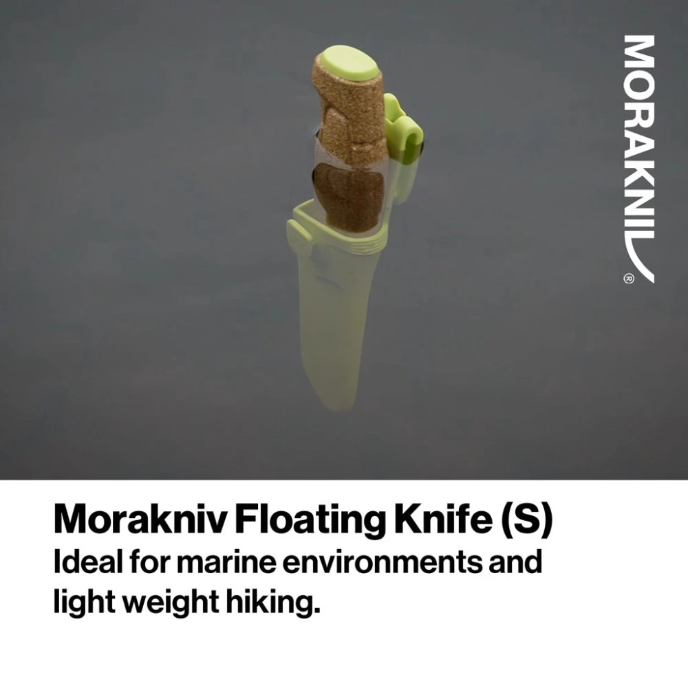 Morakniv floating knife is the perfect tool for your marine adventure, whether it’s for your fishing trip, while canoeing or working close to water. The knife that floats thanks to the natural cork handle weighs only 49 grams and has a flexible thin 1.4 mm blade made of stainless steel. It’s lime green colour is highly visible in water, making it very easy to locate. Connect the knife to your belt, backpack or lifejacket with the clip on the sheath. It’s also possible to attach it to a button, for example on your working clothes.