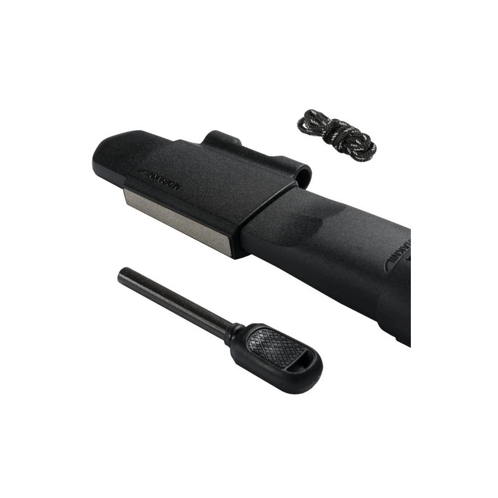 The Garberg BlackBlade™ with Survival Kit has everything a real bushcraft enthusiast needs, optimised and ready for sudden challenges. Designed to withstand the toughest challenges imaginable, a powerful full-tang knife for your next adventure. Attached to the polymer sheath comes a Survival Kit that has an integrated fire starter and a diamond sharpener. The 3.2 mm thick blade is made of high-quality carbon steel and has a Scandi grind edge profile that makes it easy to keep sharp. The spine is ground to a 90º sharp angle making it compatible with the fire starter. The knife has a DLC-coating that is not just aesthetically pleasing but also resistant to corrosion and scratching.The handle is specially made from an extra-rugged polyamide with a rhombus pattern grip. The product is also equipped with a reflex paracord that can be attached to the fire starter.