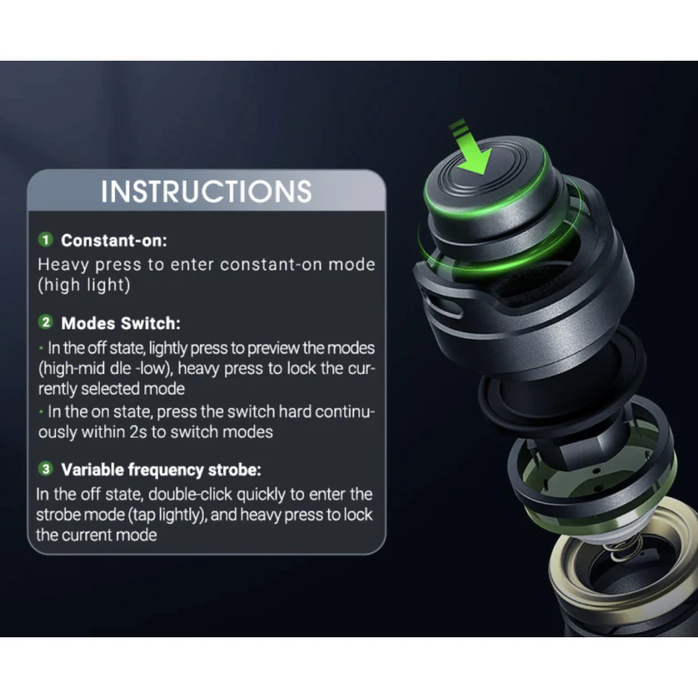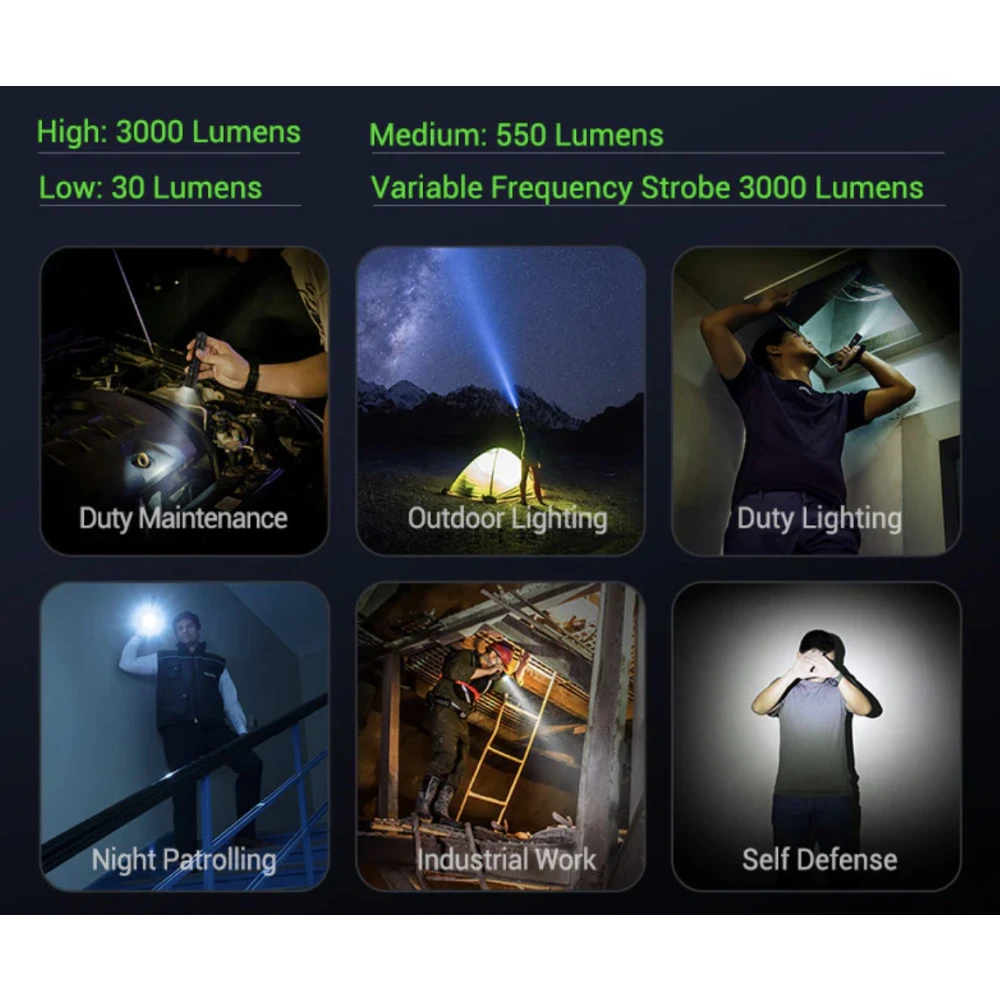 HIGH: 3000 lm, Runtime: 2hr30min, Beam Distance: 210m