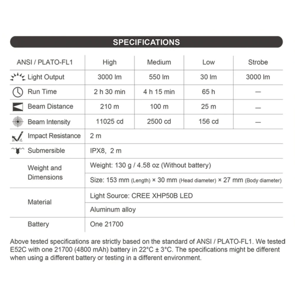 Above tested specifications are strictly based on the standard of ANSI / PLATO-FL1. E52C tested with one 21700 (4800mAh) battery in 22°C ± 3C. The specifications might be different when using a different battery or testing in a different environment.