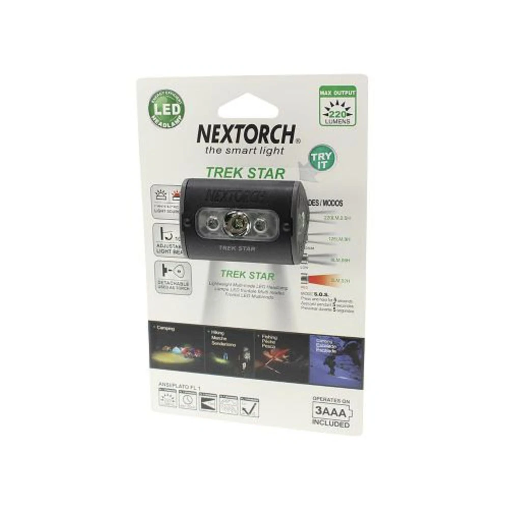 Lightweight and easy to operate, the NEXTORCH Trek Star multi-mode LED headlamp, with a max output of 220 lumens, is less than half the weight of ordinary headlamps, and has multi-mode capability, including white and red LED output. Preset with four lighting modes, Trek Star is powered by 3x AAA batteries (included), can run for up to 98 hours, and is easy to operate with a single anti-skid side switch for 4 mode toggle, and hidden one-touch strobe. Available in black.
