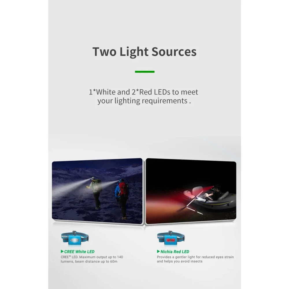 - Light Source: 1 x CREE White LED, 2 x Red LEDs