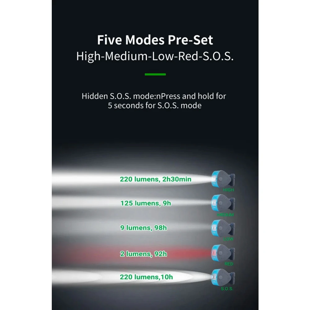 - Output: 220 lm / 125 lm / 9 lm / 2 lm (Red)