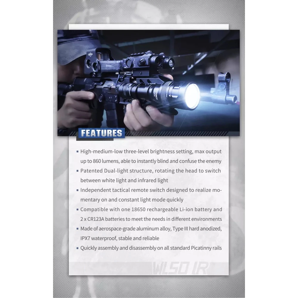 The WL50IR White/IR Weapon Light integrates high-powered illumination and infrared capability into one robust tool. With a white light output of 860 lumens and a potent IR light feature, this tool is engineered for tactical versatility. Effortlessly mountable to Picatinny rails without tools, the WL50IR’s remote switch provides quick mode transitions, essential in critical moments. Crafted from aerospace aluminium with a Type III hard-anodised finish, and boasts IPX7 waterproof certification, along with 1 metre impact resistance and 500 G shock resistance. Whether powered by 2x CR123A batteries (included), or a single 18650, its performance is reliable, offering up to 5 hours 15 minutes of runtime in IR mode.