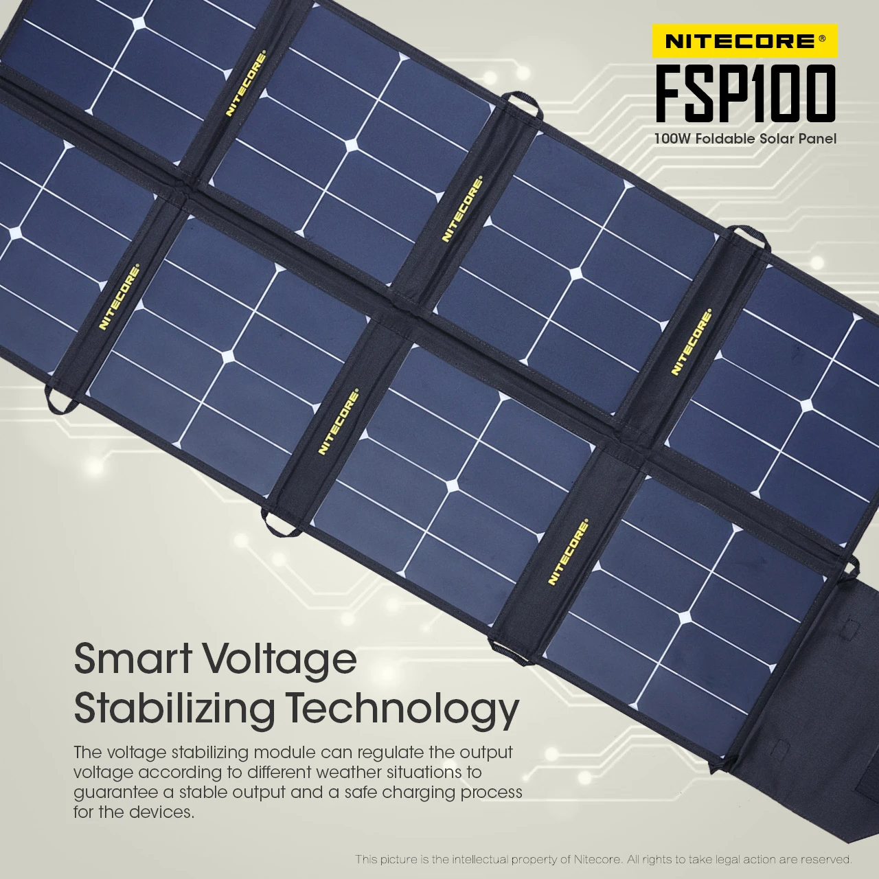 The NITECORE FSP100 is a foldable solar panel with a max output of 100W, aiming to provide unlimited outdoor power off the grid and on the go.